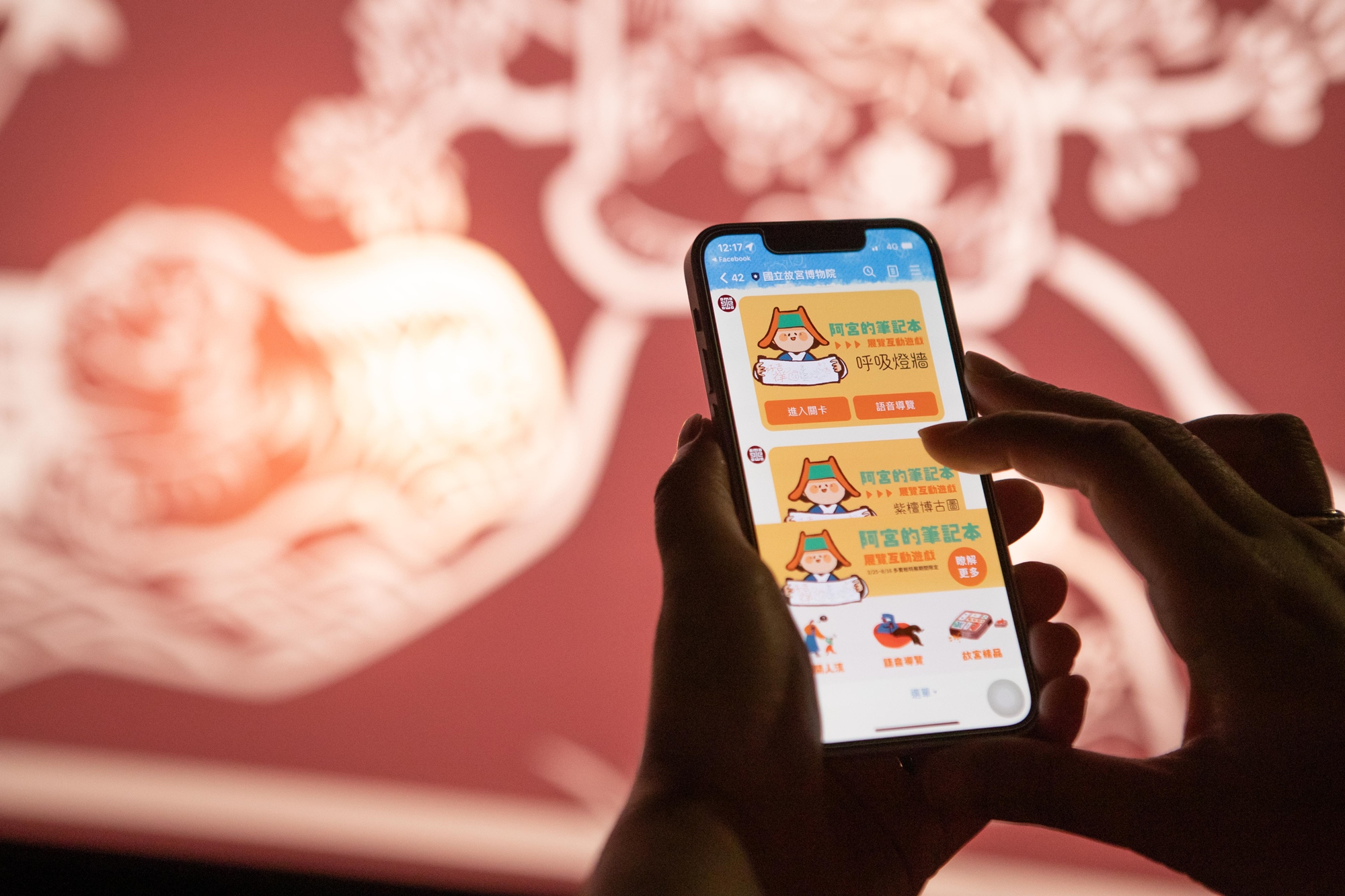 我們的提案裡設計了一個叫「阿宮」的角色,以一個親民、可愛的知識耆老形象,帶領著觀眾一起貫穿整個展場,串連故宮多方的資源與我們精心設計的展間遊戲。這次的多寶格特展,我們總共參與製作了APP與LINE的線上工具,以及在實體展場中,我們希望能轉化詮釋文物的新面貌。此外還設計了應用智慧照明系統、以剪紙藝術呈現的呼吸牆,以及掛幅將近12米的沉浸式動畫製作。