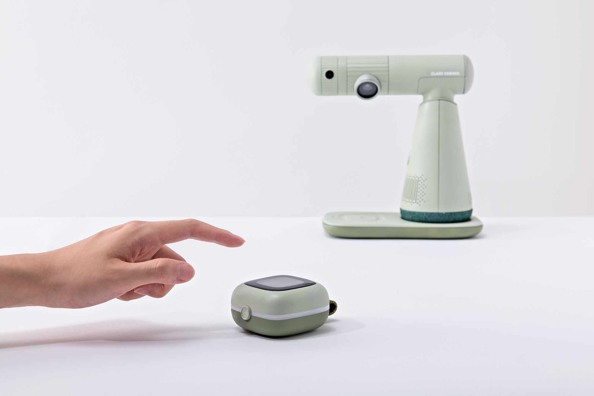 Class Corner是一款為國中小學生所設計的遠距教學輔助設備,旨在上遠距課程中提供更好的互動性及體驗。此設計由智慧投影機、互動方塊與線上教學軟體組成,智慧投影機獨立連接網路,投影出即時課程內容,學生能即時拍攝、分享作業畫面,幫助老師掌握學生學習成效。互動方塊透過上課提醒、搶答、提問等功能,增強遠距教學的互動性,也能透過加分、評價等功能,給予學生即時的反饋。