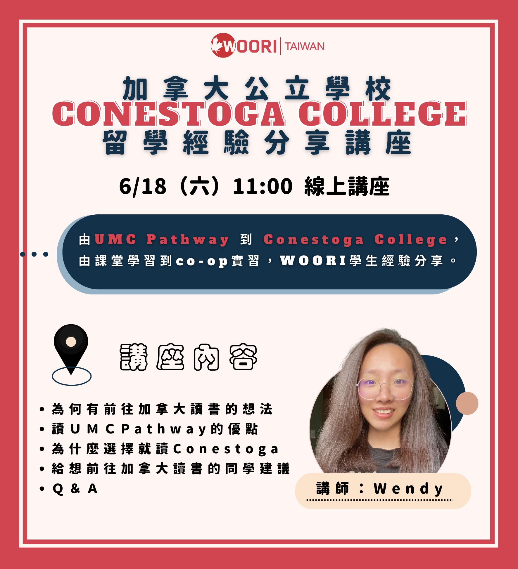 由UMC Pathway到Conestoga College,由課堂學習到Co-op實習,本次邀請過去通過WOORI申請的學生 - Wendy 分享Pathway課程及Conestoga學院留學經驗分享,目前Conestoga就讀的她同時也會分享Co-op實習的經驗!