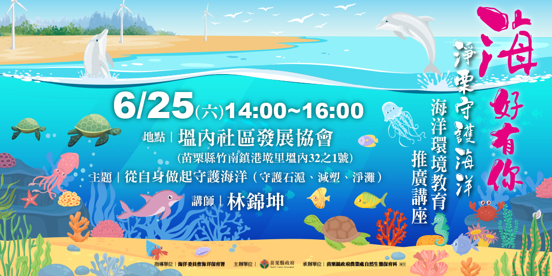6/25苗栗縣政府推出【海好有你 淨栗守護海洋】海洋環境教育推廣講座,此次講座邀請到熟悉苗栗自然生態、關切苗栗自然生態保育議題的苗栗縣自然生態學會前任理事長—林錦坤老師,講解如何從自身做起守護海洋(守護石滬、減塑、淨灘),希望可以透過此次講座,讓民眾認識家鄉珍貴的海洋文化、海洋對生活環境的影響以及我們要如何透過生活體驗守護海洋永續經營,快抓緊時間來報名吧