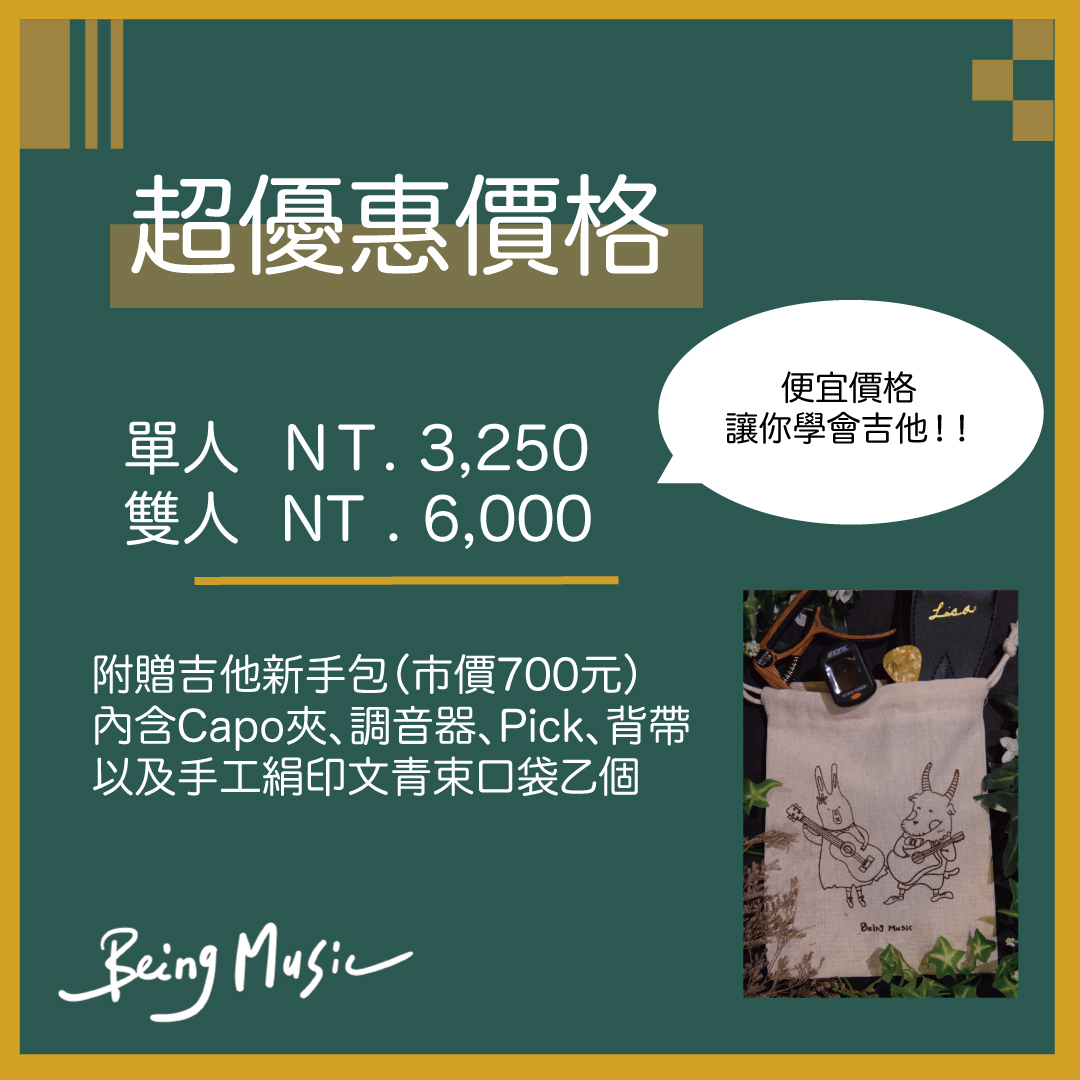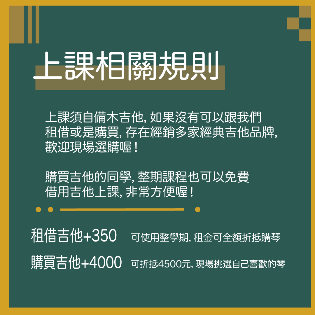 🎸額外+350 元(整期課程皆可使用教室吉他,如果最後決定在存在購買,可全額折抵)