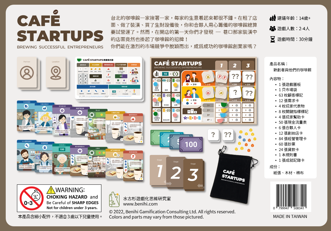 這是全世界第一套透過開設咖啡館創業的情境來讓玩家學習商業模式與創新思維的桌遊教具。遊戲的架構係建立於「精實創業」(Lean Startup) 方法及「精實畫布」(Lean Canvas) 工具之上,並透過創造儘可能貼近真實世界的遊戲體驗,來讓玩家感受到產品創新及創業過程所需面對的挑戰。教具的規則與機制已經在過去三年進行超過 300 場以上的迭代測試,且教具所提供的體驗與教育效果也獲得超過 500 多位測試者的肯定,其中包括多位產業專家、大學教授及桌遊達人。我們即將於今年完善最後的視覺設計並對外發行,以讓更多人能夠透過這套教具體驗並學習創新、創業的方法。