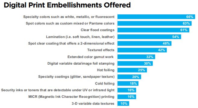 2020年,NAPCO Research發布「為數位印刷增值」報告指出,數位印刷目前正是印刷產業提高獲利的趨勢,其中最受設計師歡迎的增值功能為特殊墨、專色及透明塗層(圖一),而數位印刷可提供更新更有效率、少量多樣、依需求的特殊效果製作應用待給無限創新的可能。