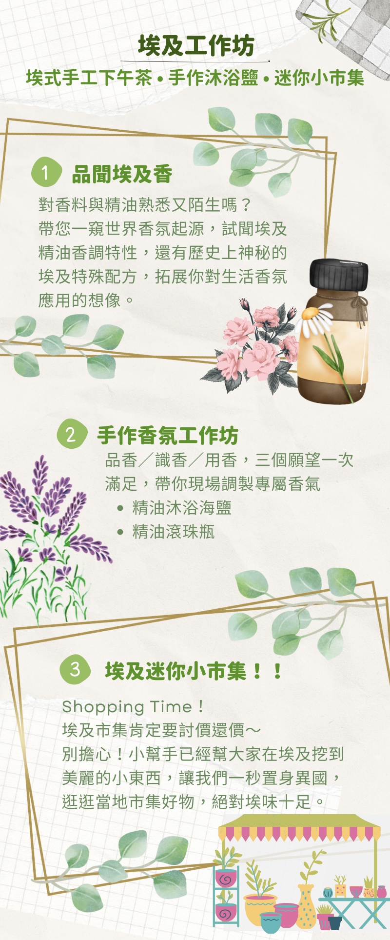 從品香、識香到玩香,三個願望一次滿足,精選三種埃及私藏配方,帶你現場實際製作專屬香氣的「精油沐浴海鹽」與「精油滾珠瓶」: