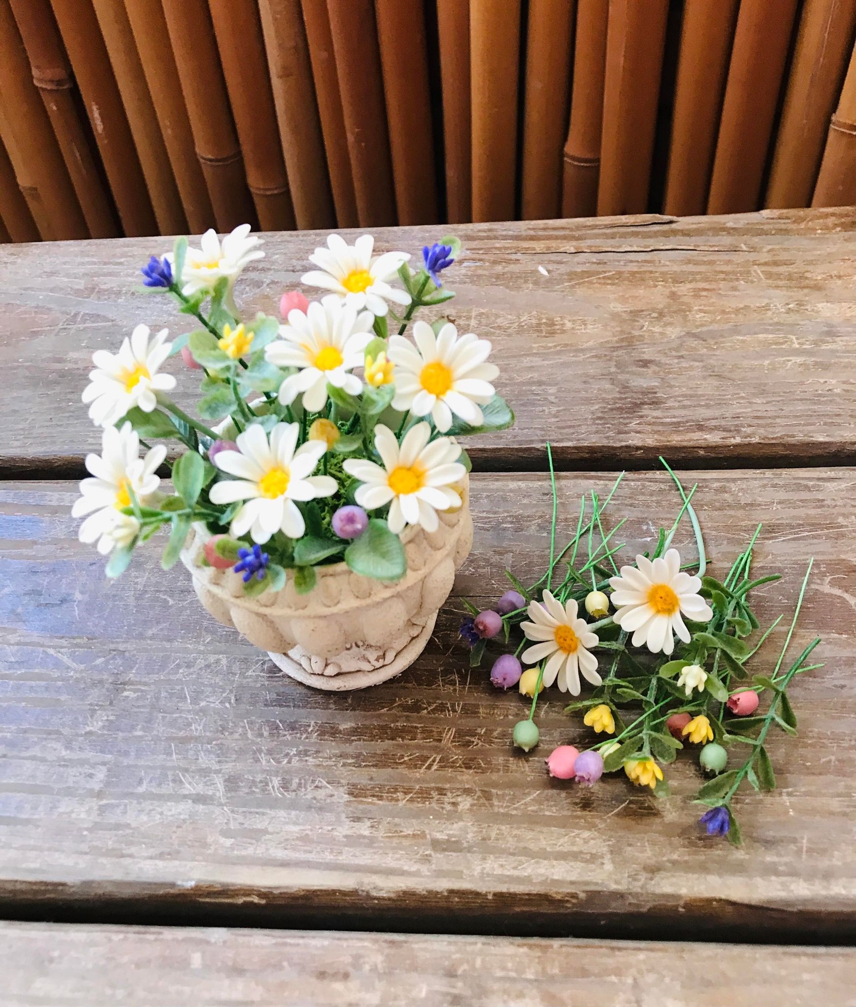 2、將做好的瑪格麗特及小菓子黏土花,搭配小荳子人造花,組盆插在創意的金屬花瓶裏。(花瓶尺寸8*8*8cm,完成作品尺寸:8*8*12cm)