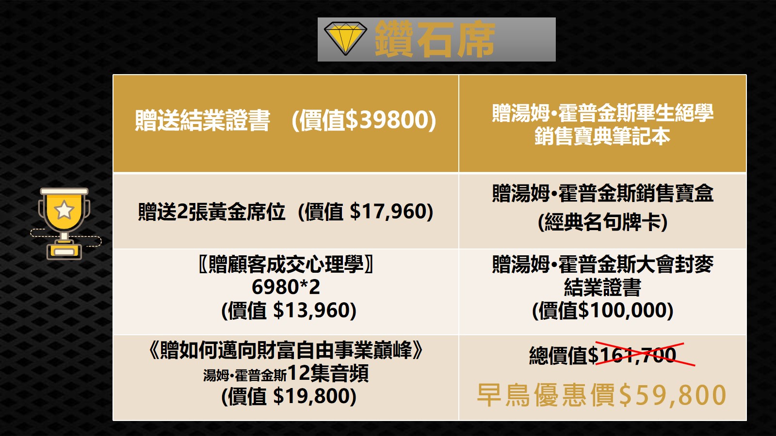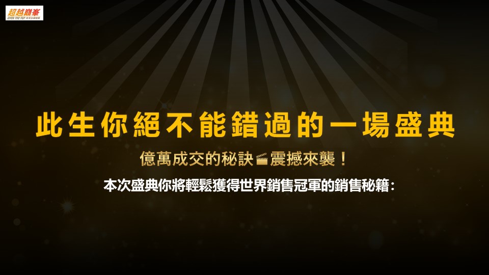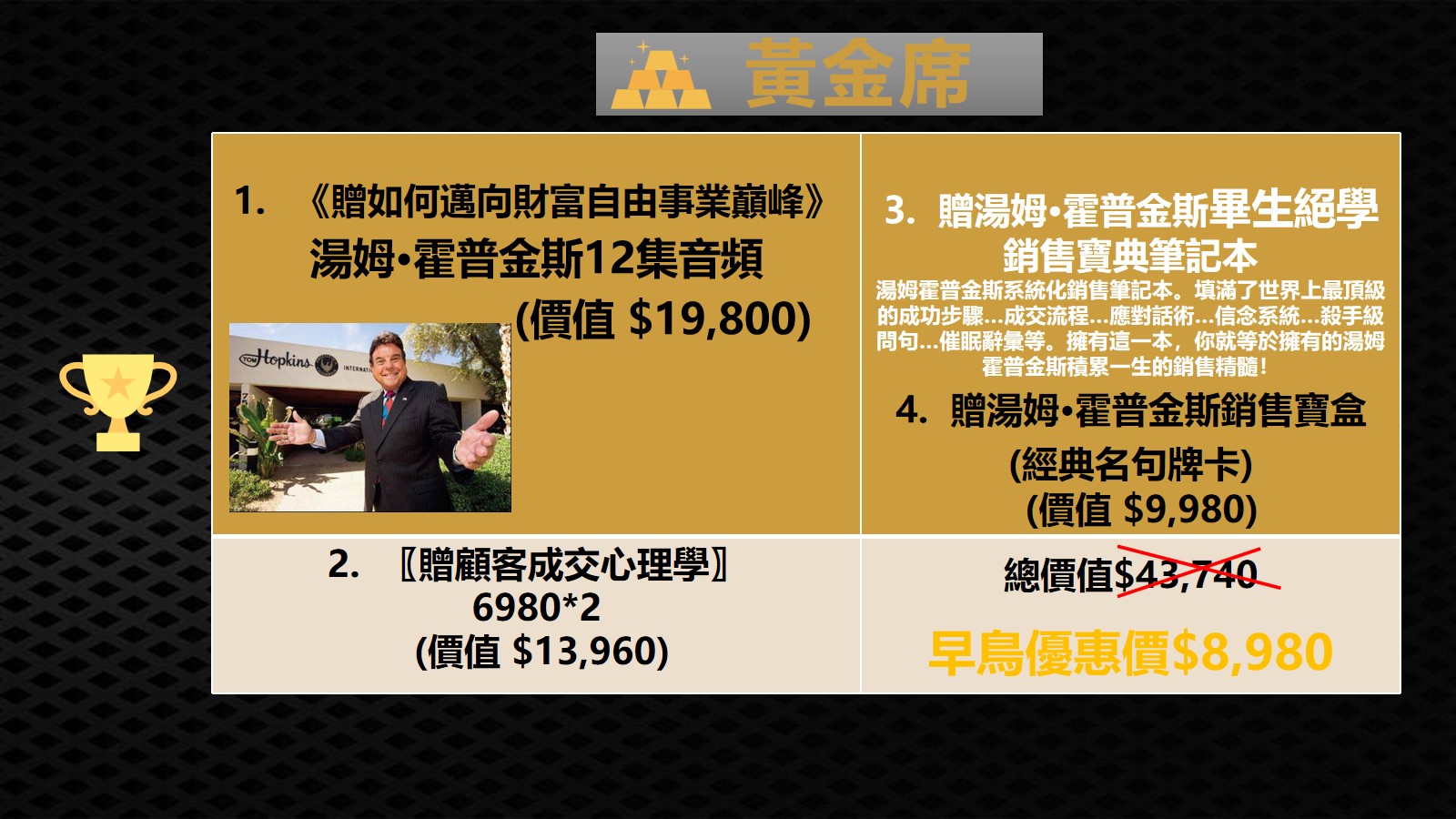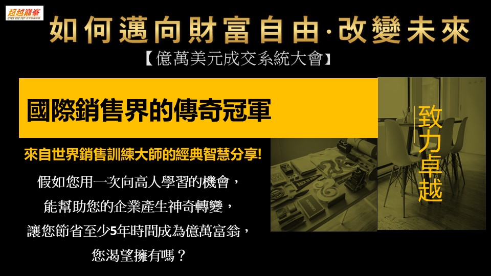 - 當你學會了全世界最頂尖的銷售方法,同時結交超過1000位最頂尖企業家及億萬富翁的人脈,而你的競爭對手沒來,你將大幅度領先競爭對手成為行業中的第一名!
