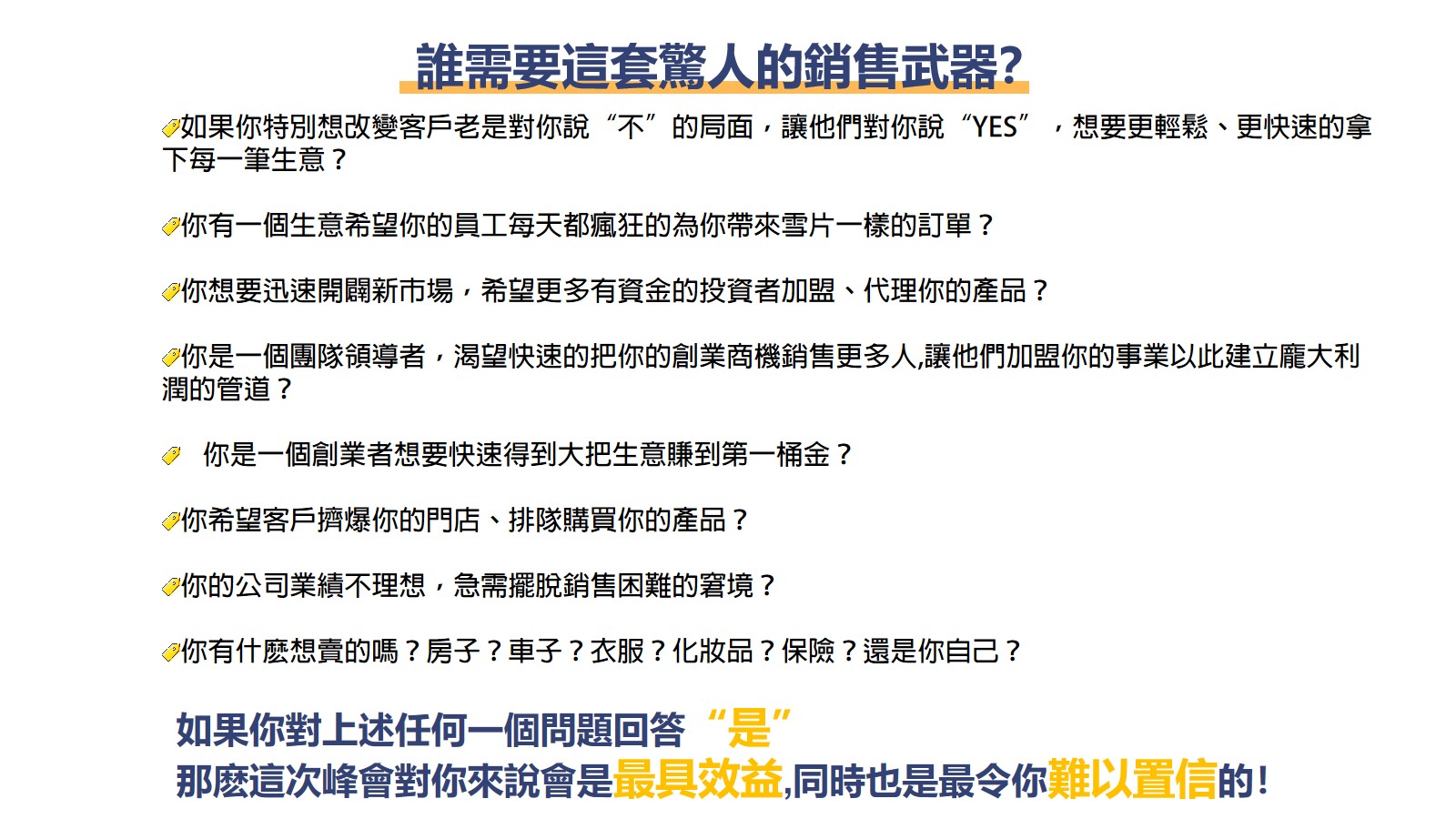 你將掌控一套世界級、系統化的銷售技巧,真正解決業務上的各種問題,立即提升銷售業績,讓銷量一夜間火起來!