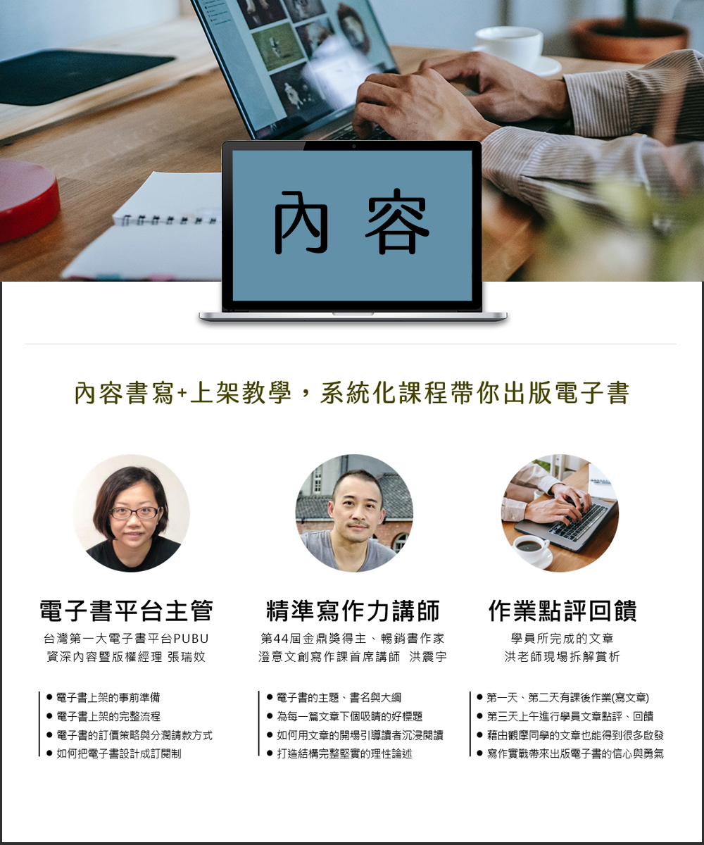 讓身兼國家級金鼎獎得主、暢銷書《精準寫作》的作者、澄意文創寫作課首席講師 - 洪震宇老師,及年營收破億、台灣第一大電子書平台Pubu (湛天創新科技) 資深內容暨版權經理 - 張瑞妏 ,用三天課程的時間,帶領你寫出並上架你的第一本電子書!