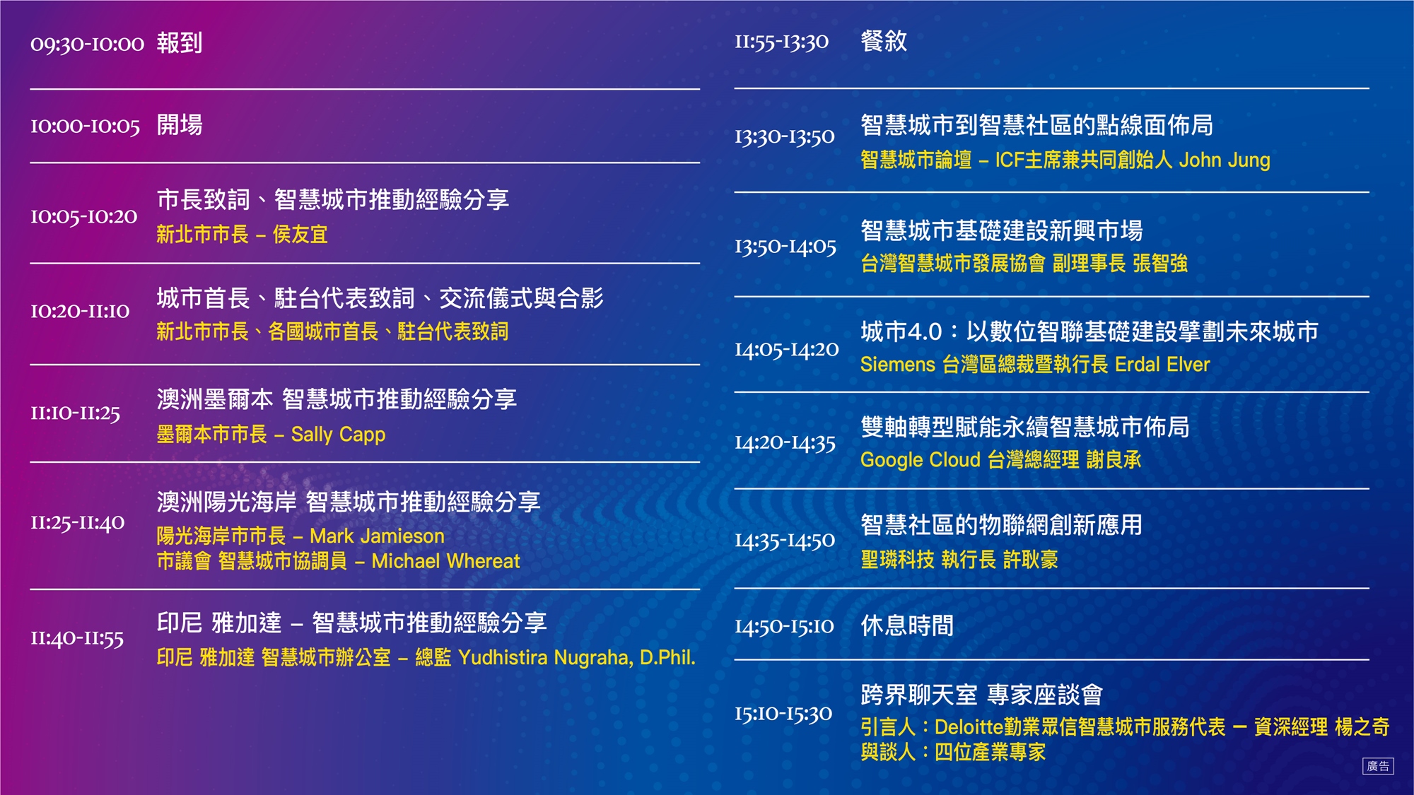 本次國際論壇將以「智慧城市、永續發展」為核心主軸,透過國際城市治理分享與產官各界之交流,讓城市經驗及產業觀點智「匯」新北,共同探討城市如何在新常態生活中,找出下一世代的智慧永續「方城市」。