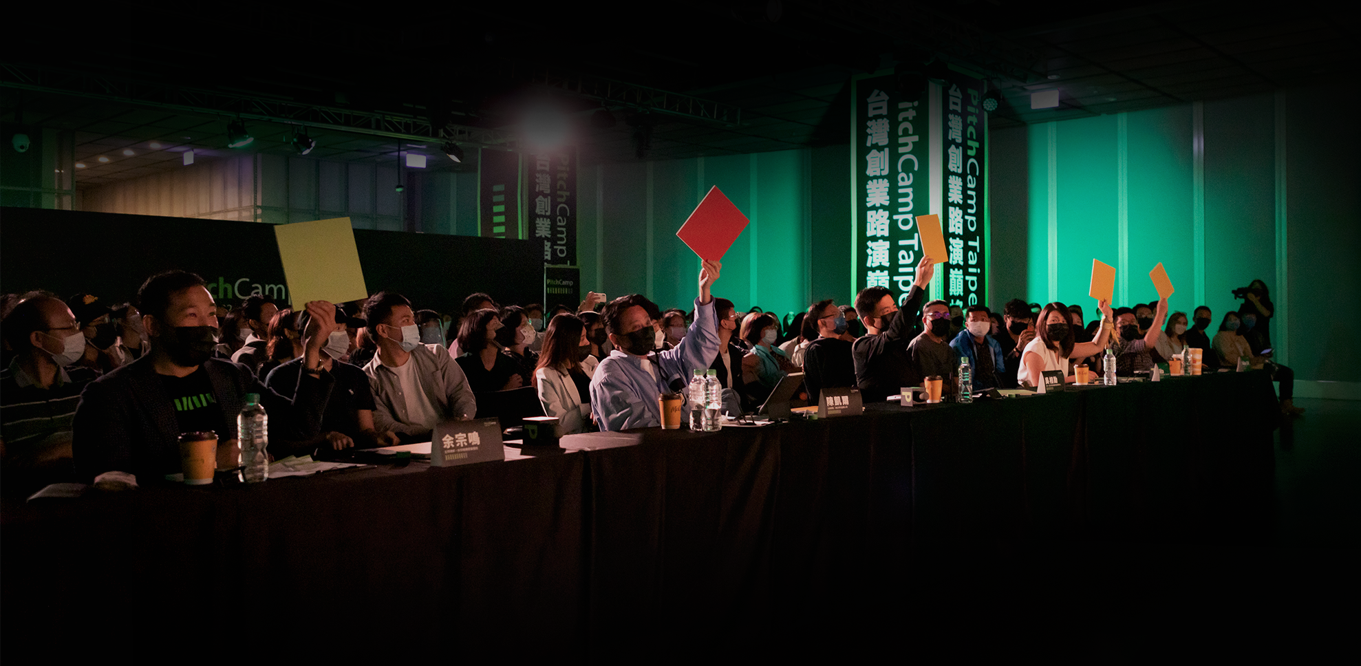 上下圖分別為 PitchCamp 2022 活動現場,及活動當日投資人評審現場舉牌畫面。