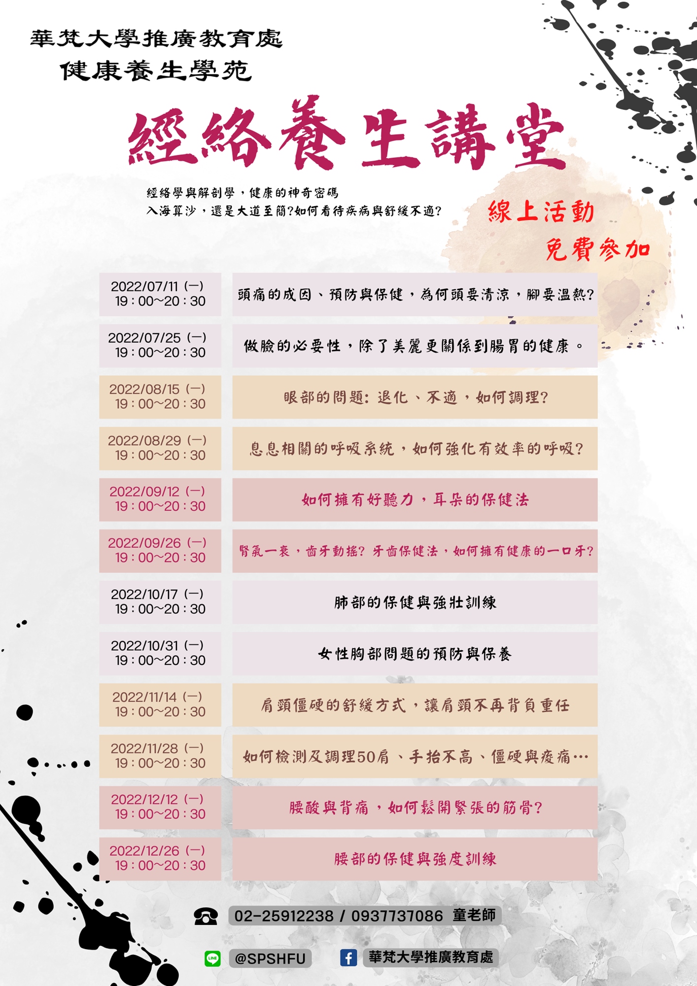 1. 2022/07/11(一)19:00~20:30頭痛的成因、預防與保健,為何頭要清涼,腳要溫熱?