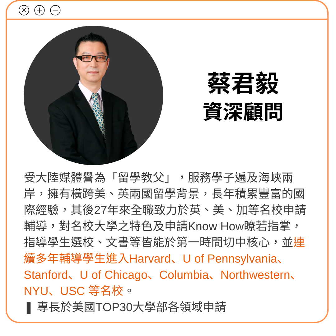 進入美國頂尖大學,除了優異的學術成績,充滿個人獨特優勢與風采的文件才是必勝關鍵,聽聽留學教父是如何帶學生走向峰頂的道路。(美、加資深顧問-蔡君毅)