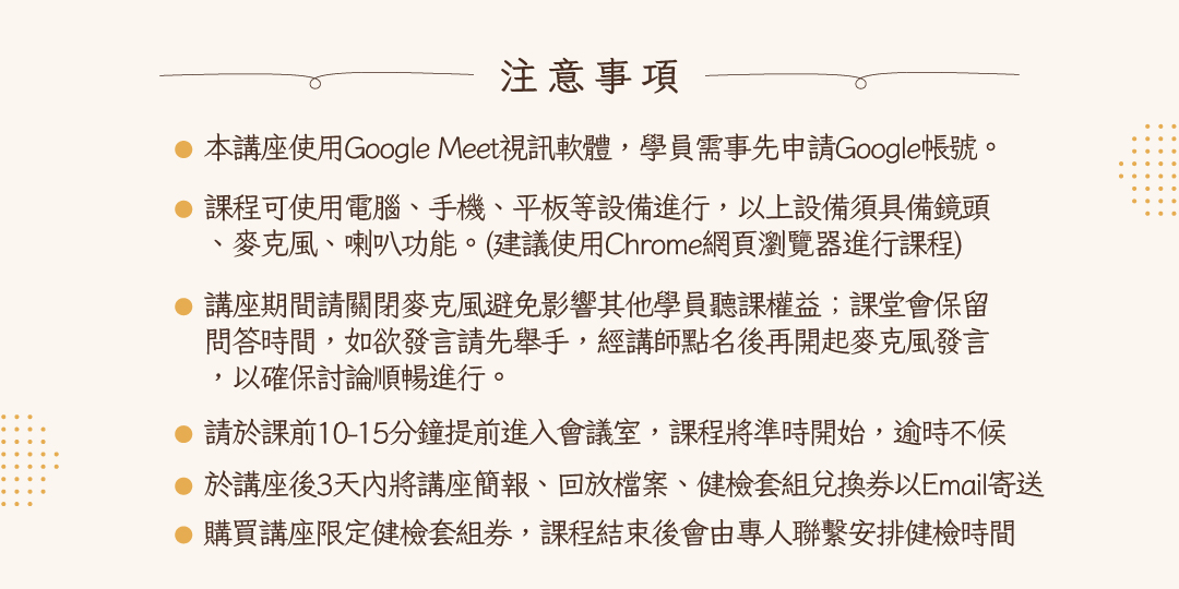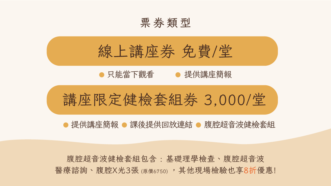 ▪ 講座限定健檢套組券($3,000):課後提供講座簡報、回放連結、含1次腹腔超音波健檢套組