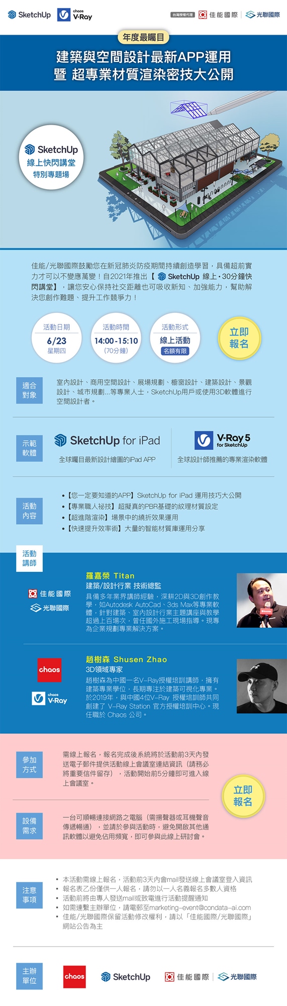 另外也特別邀請到Choas(V-Ray渲染器)原廠的V-Ray for SketchUp 3D領域專家【趙樹森 Shusen Zhao】為各位分享進階的渲染材質設定,以及效率職人使用的智能材質庫運用!僅此一場,錯過可惜💯💯💯