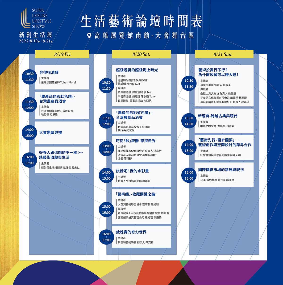 13場生活藝術論壇,主題涵蓋「藝術投資、收藏關鍵之鑰、美酒品評、珠寶設計、 國際攝影 」等多元面向論壇講座,22位生活品味達人大方分享不藏私!憑新創生活展當日門票即可進入舞台區參與論壇活動。