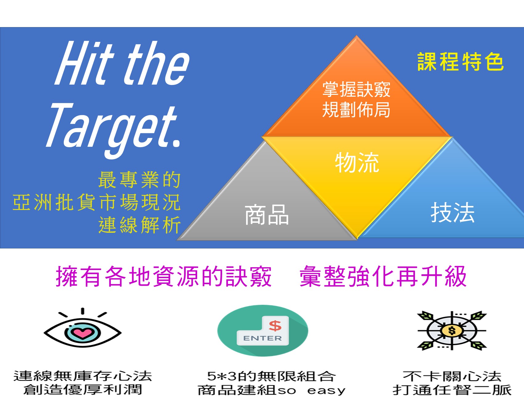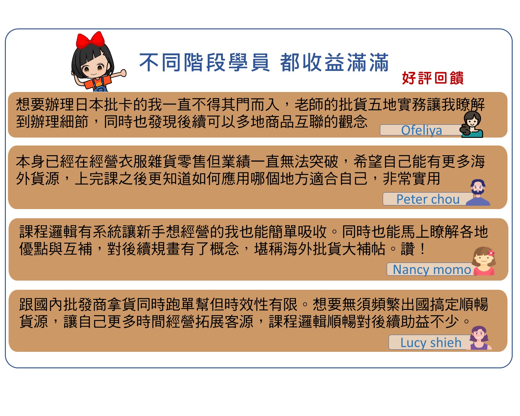 講座提供最完整且即時的海外批貨市場現況,無論進出與否都能貨暢其流的關鍵。除了能通曉各區域商品強項外,同時也解析相互聯結的利基,後續建立自己強大的商品進貨網絡。是起步新手小白或已經營的業者最佳助手講座中的四大面向