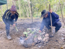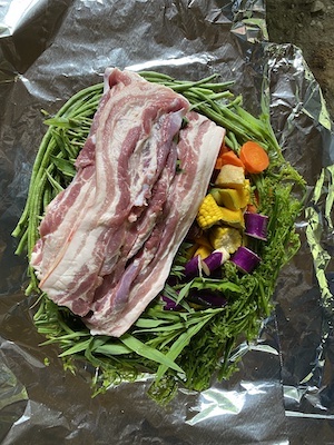 用山裡的木柴與河床的石頭堆疊成塔,再升起火將塔中的木頭燃燒殆盡,整座 icibi 塔燒至完全崩塌。最後放入新鮮地瓜,菇,野菜,五花肉等等食材,只要 耐心等待,讓自然帶給你最原始的美滋美味。