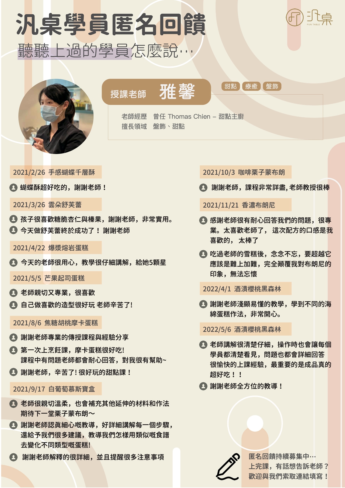 汎桌於每次上課後,都會邀請學員填寫「匿名」回饋單