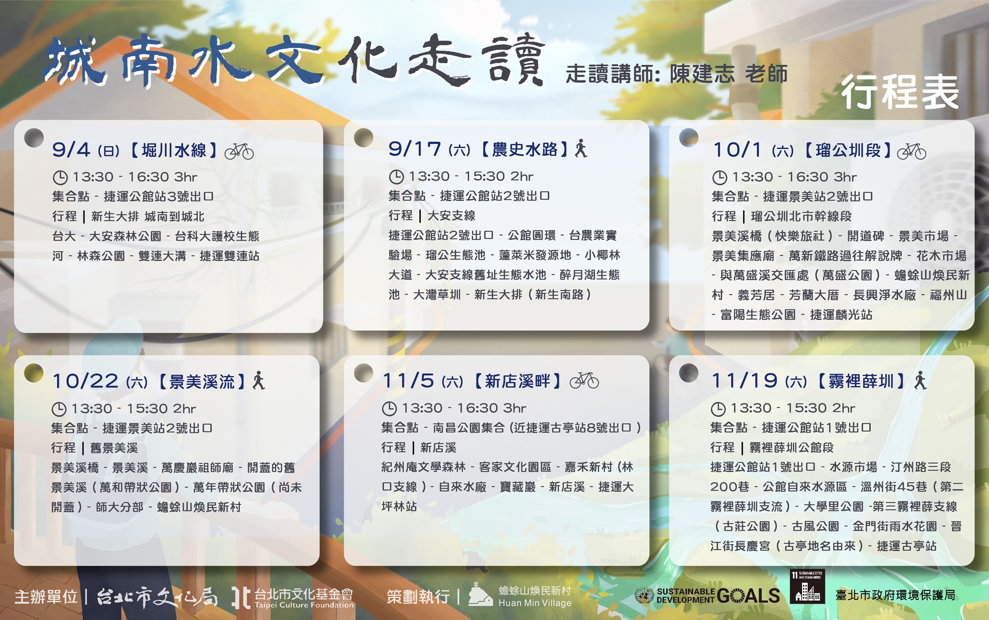 9/4 (日) 13:30–16:30 | 堀川水線 捷運公館站3號出口 | (新生大排)城南到城北:台大→大安森林公園→北科大護校生態河→林森公園→雙連大溝→捷運雙連站 | 自行車($300) |
