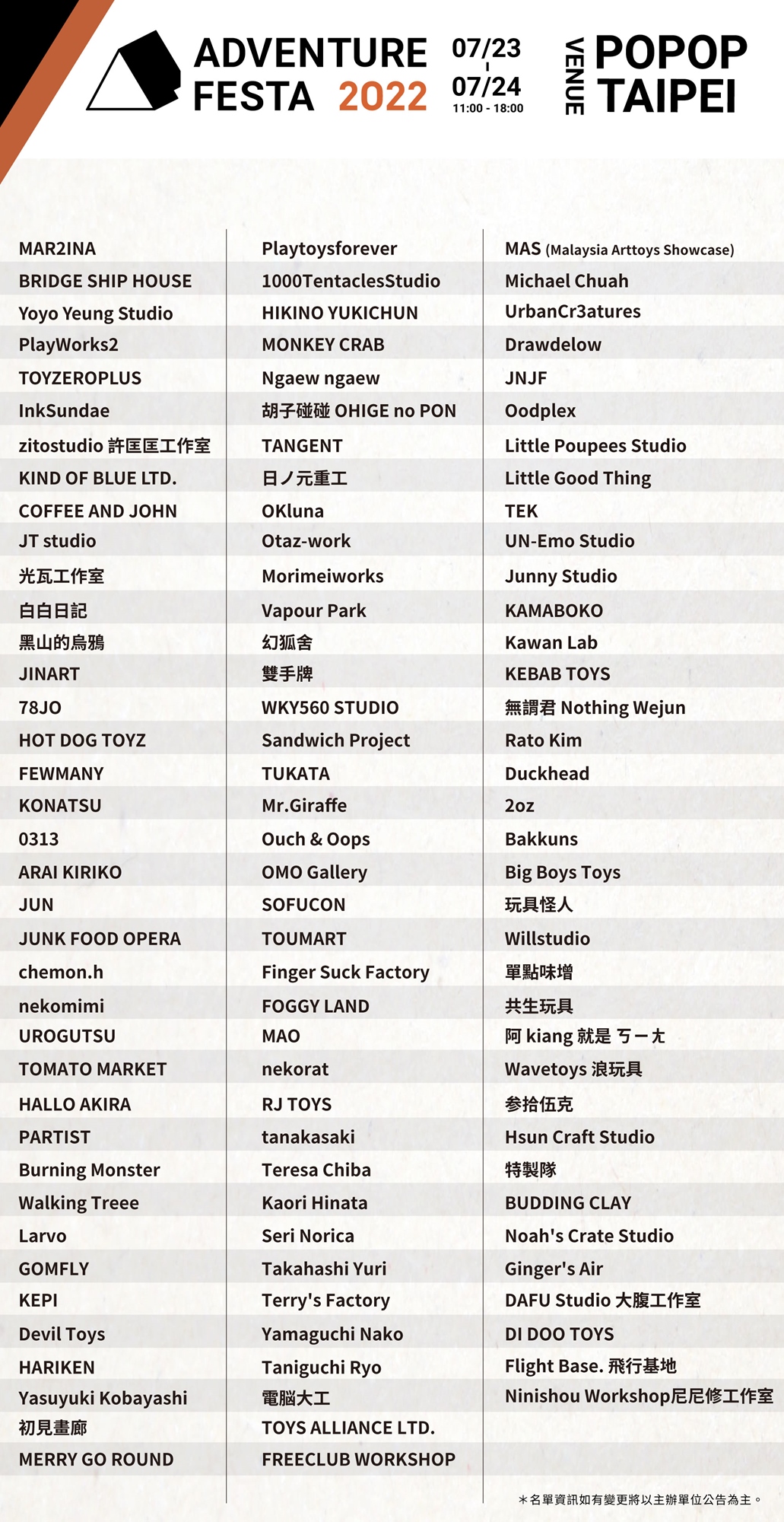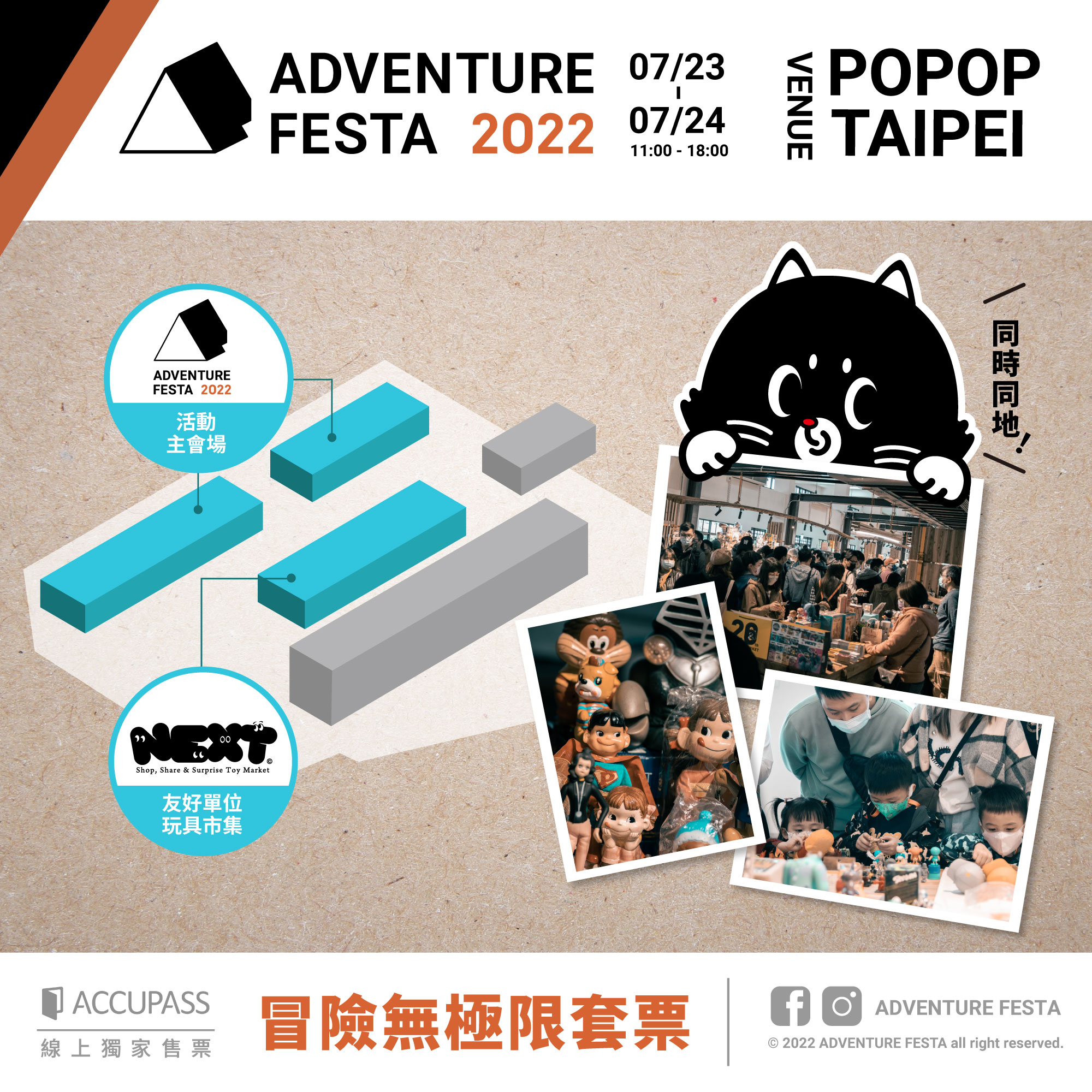 第一屆 “ADVENTURE FESTA” 將於 2022年7月23日(六)、24日(日)兩天,在南港瓶蓋工廠台北製造所 熱鬧登場。以「原創角色」為核心,集結來自日、韓、馬、泰、中、港、台的平面/立體/數位藝術創作品牌,共同迎向充滿挑戰與想像力的冒險旅程!