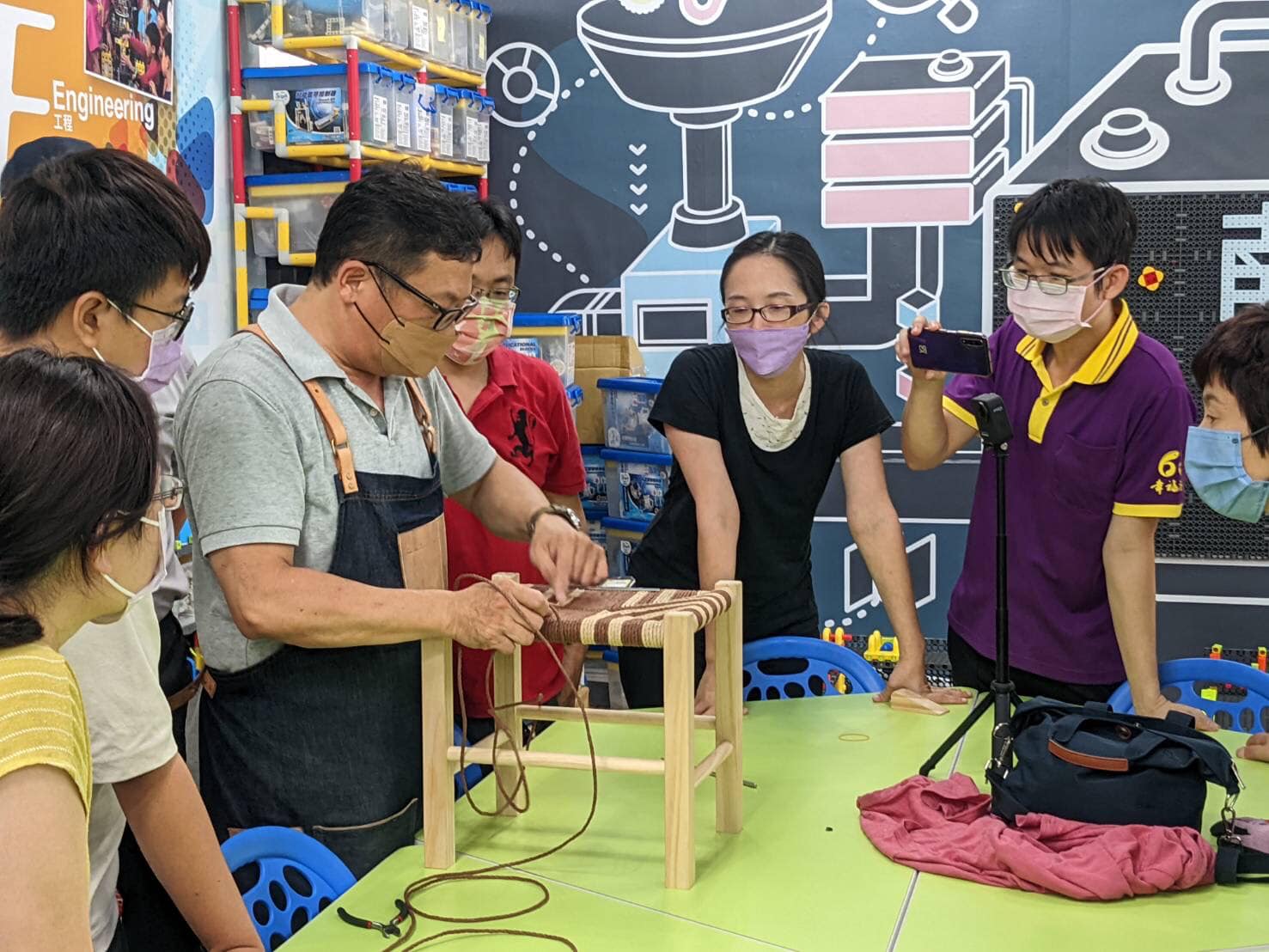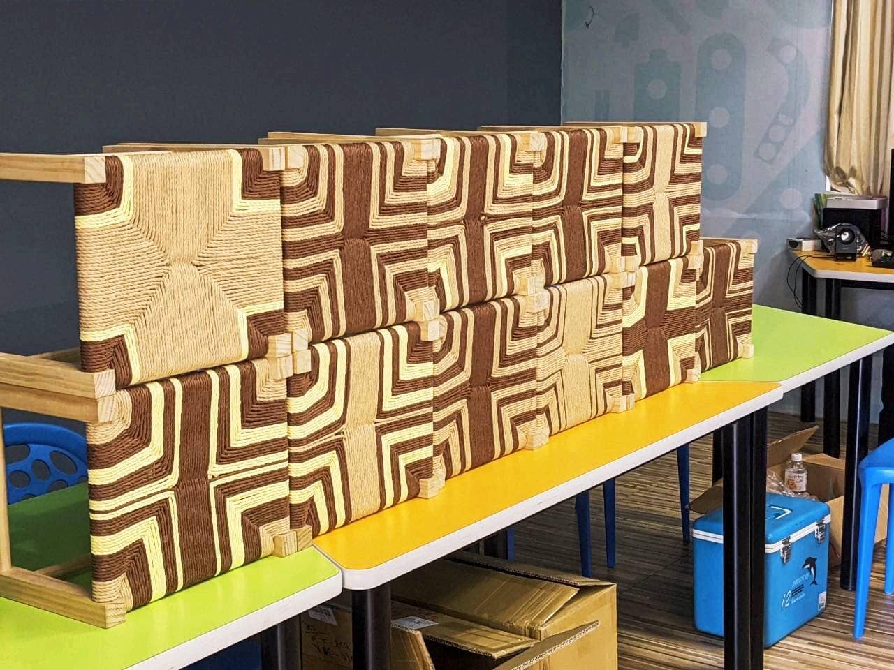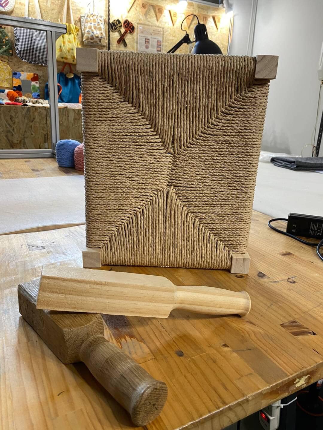 本堂課程主要學習紙藤編織方法與技巧,編織椅面可使用3~4種顏色紙繩做跳色編織,講師採用自製工具讓學員更有效率的完成編織椅面