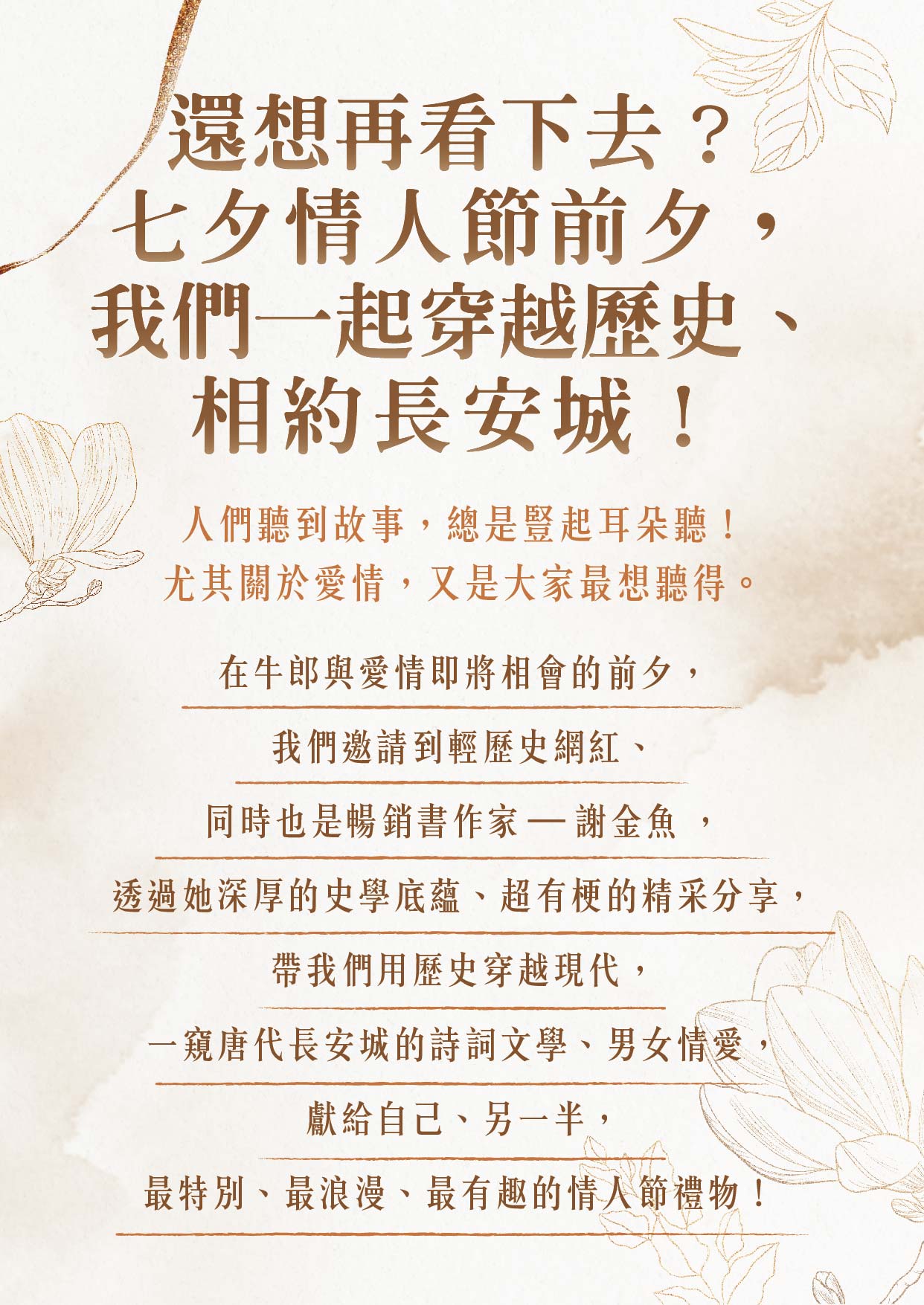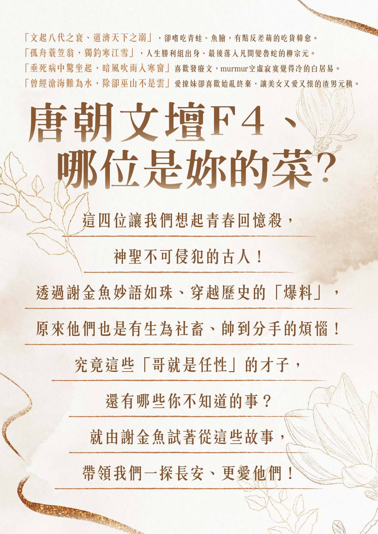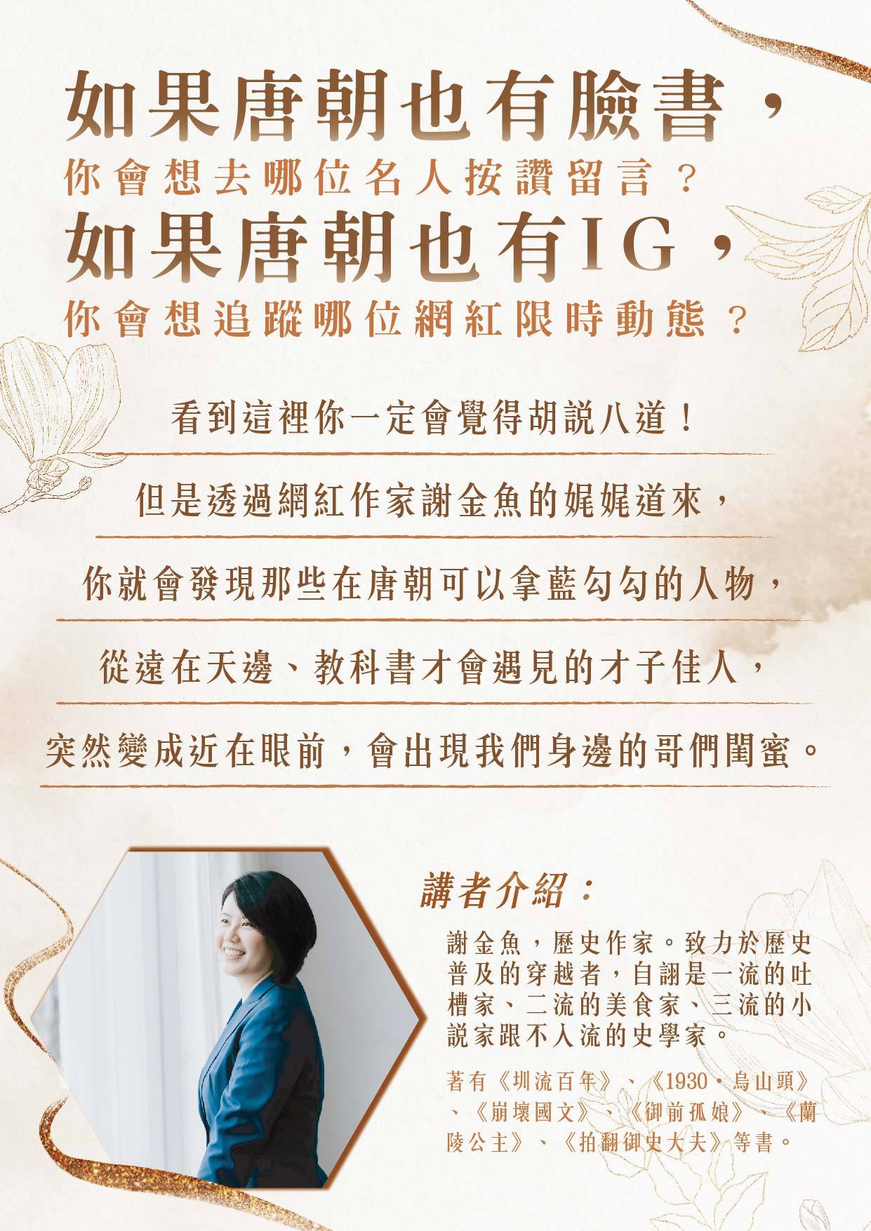 謝金魚,歷史作家。致力於歷史普及的穿越者,自詡是一流的吐槽家、二流的美食家、三流的小說家跟不入流的史學家。著有《圳流百年》、《1930・烏山頭》、《崩壞國文》、《御前孤娘》、《蘭陵公主》、《拍翻御史大夫》等書。