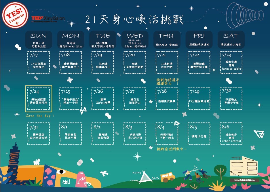 為了讓大家能夠擁有一個暢談新觀點、汲取新知識,互相溝通一起成長的平台,最新成立的TEDxXinyi Idea Bar將持續地為社群成員帶去不一樣的都會體驗。今年,加入TEDxXinyi Idea Bar的大家可以進一步感受Self-Empowerment所帶來的由內而外的喚活,體驗TEDxXinyi2022特別制定的“21天喚活挑戰”,從都會在地、身體賦能、營養餐食和講者智慧四大維度營造好好生活的儀式感。讓社群成員們能夠,自我成長,結交朋友,拓展同溫層,文化交流 等 ,豐富且不可思議的社群體驗。