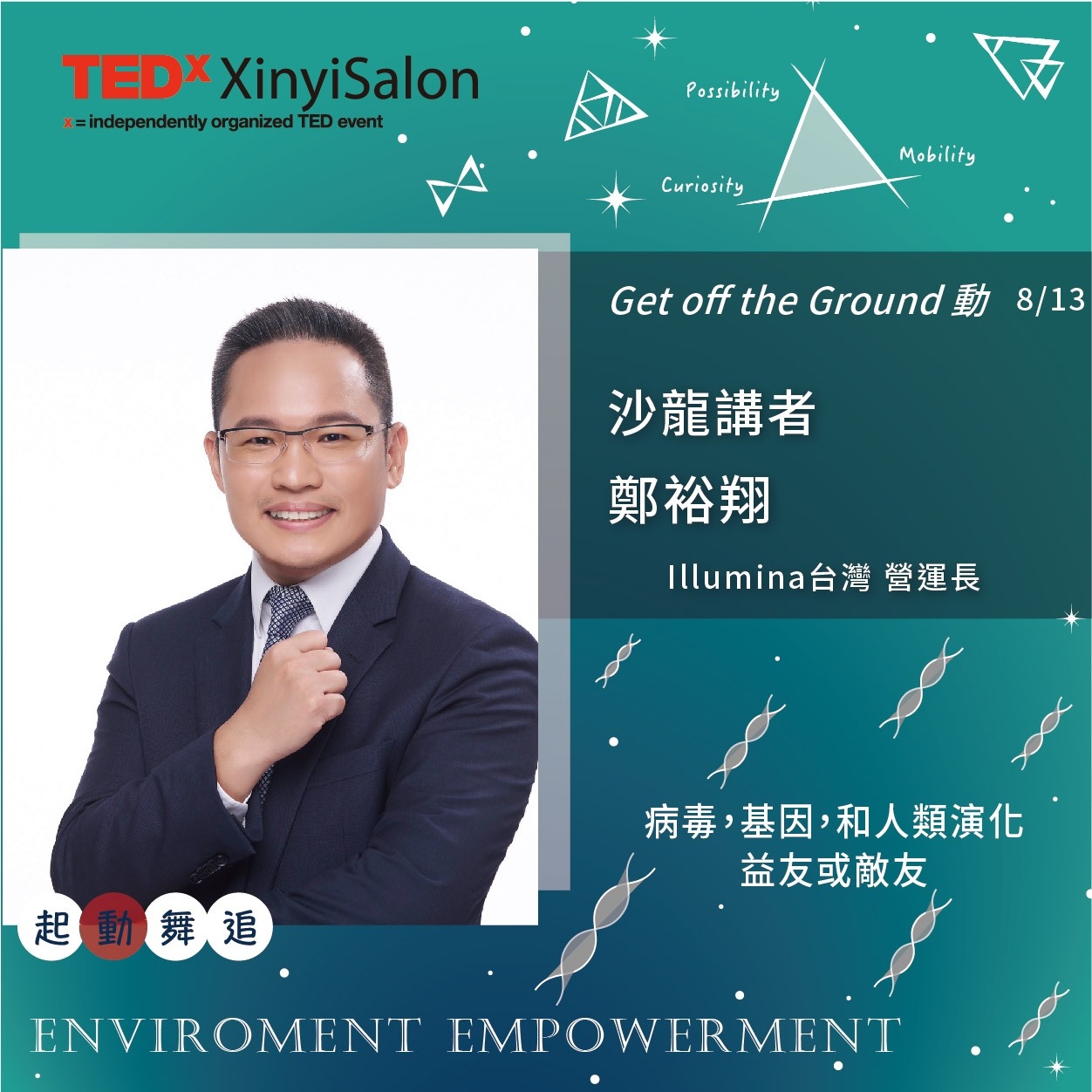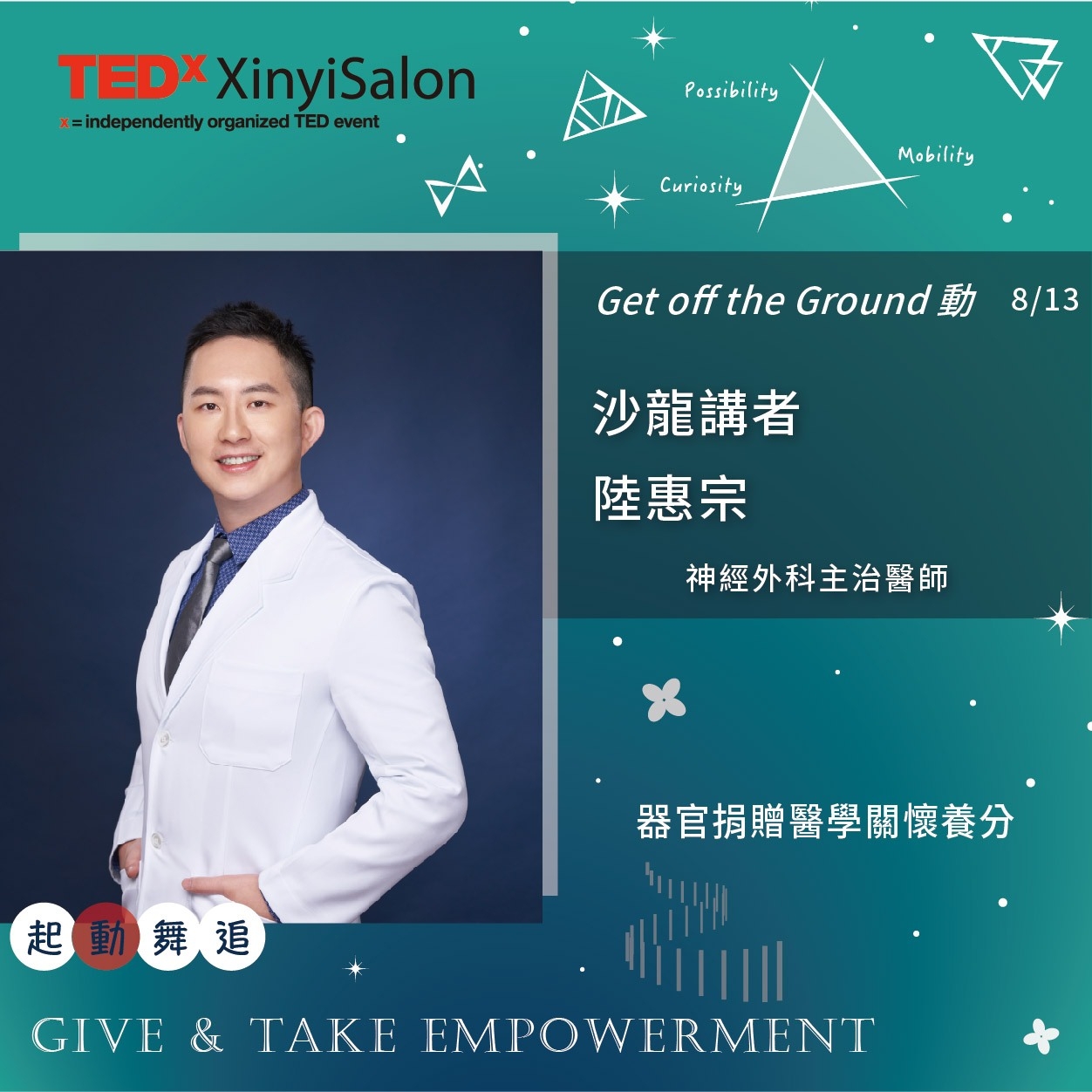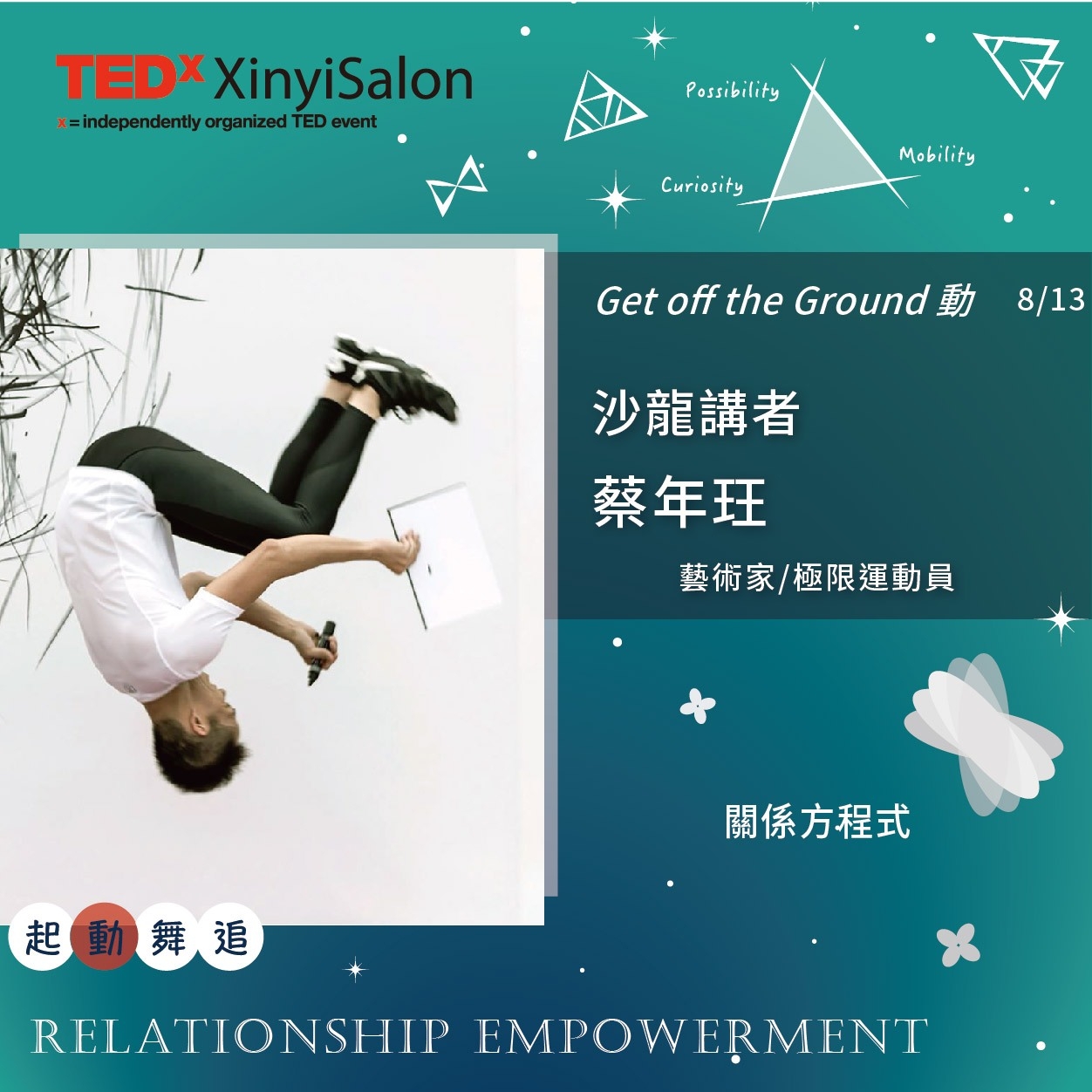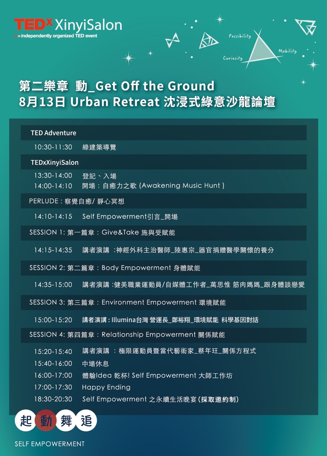 8月13日,TEDxXinyi 展開Get off the ground 身歷其境的五感體驗。來自醫學、健身、基因、關係四大領域的講者—— 陸惠宗醫師、萬思惟(筋肉媽媽)健美職業運動員、鄭裕翔營運長以及當代藝術家暨極限運動員蔡年玨,協同靜心藝術療癒、奇異果的營養啟示、生態虛擬晚宴三大工作坊,讓大家在”to relearn” ,”to feel”以及"to commit "的同時體驗身心喚活。