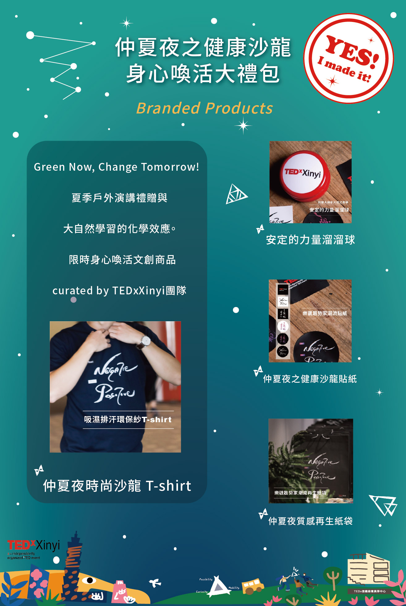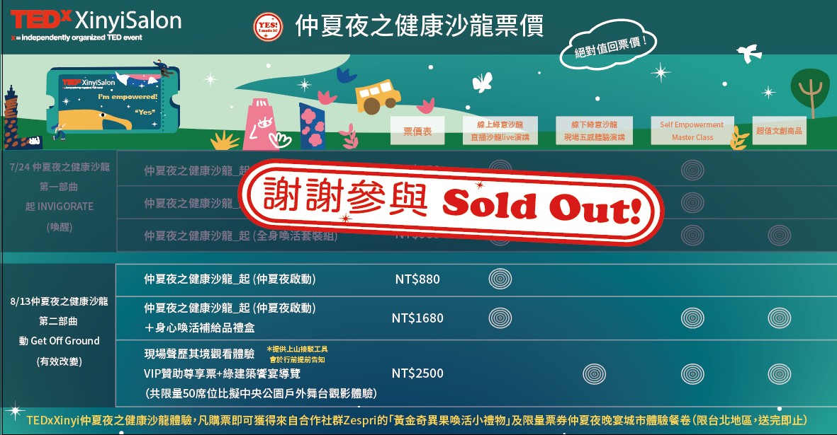 - 2500元票種:線下專屬體驗(四場線上直播演講+一場線上工作坊(三場擇一)+身心喚活大禮包(TEDxXinyi特別企劃文創商品))