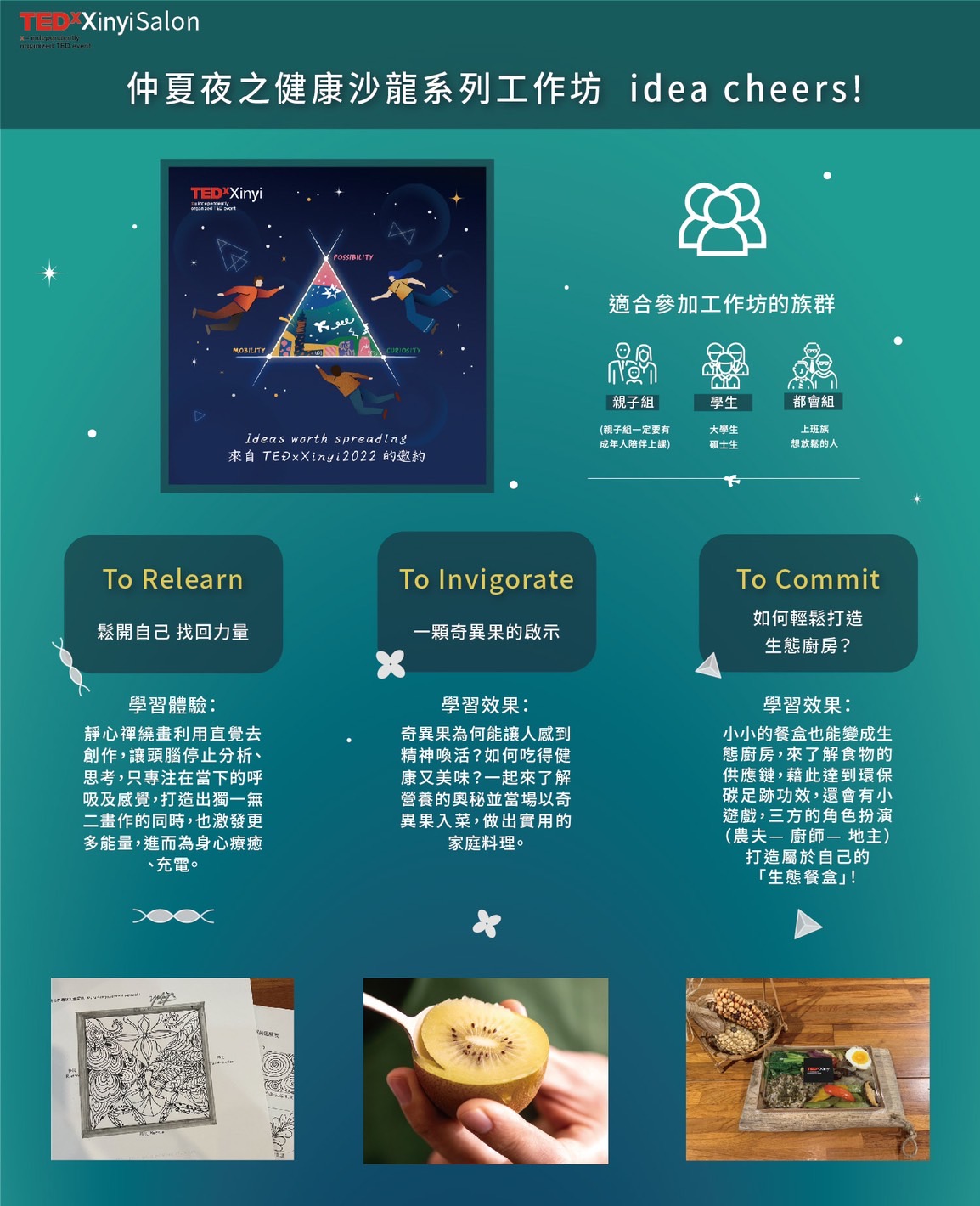 💡三場身歷其境體驗工作坊(靜心禪繞畫、城市生態廚房、一顆奇異果的啟示):三場擇一