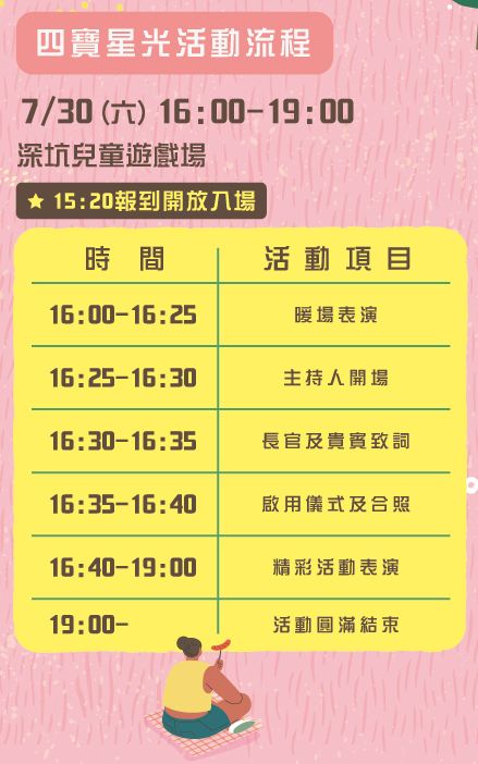 - 16:00-16:30 報到(深坑兒童遊戲場-新北市深坑區平埔街3號)