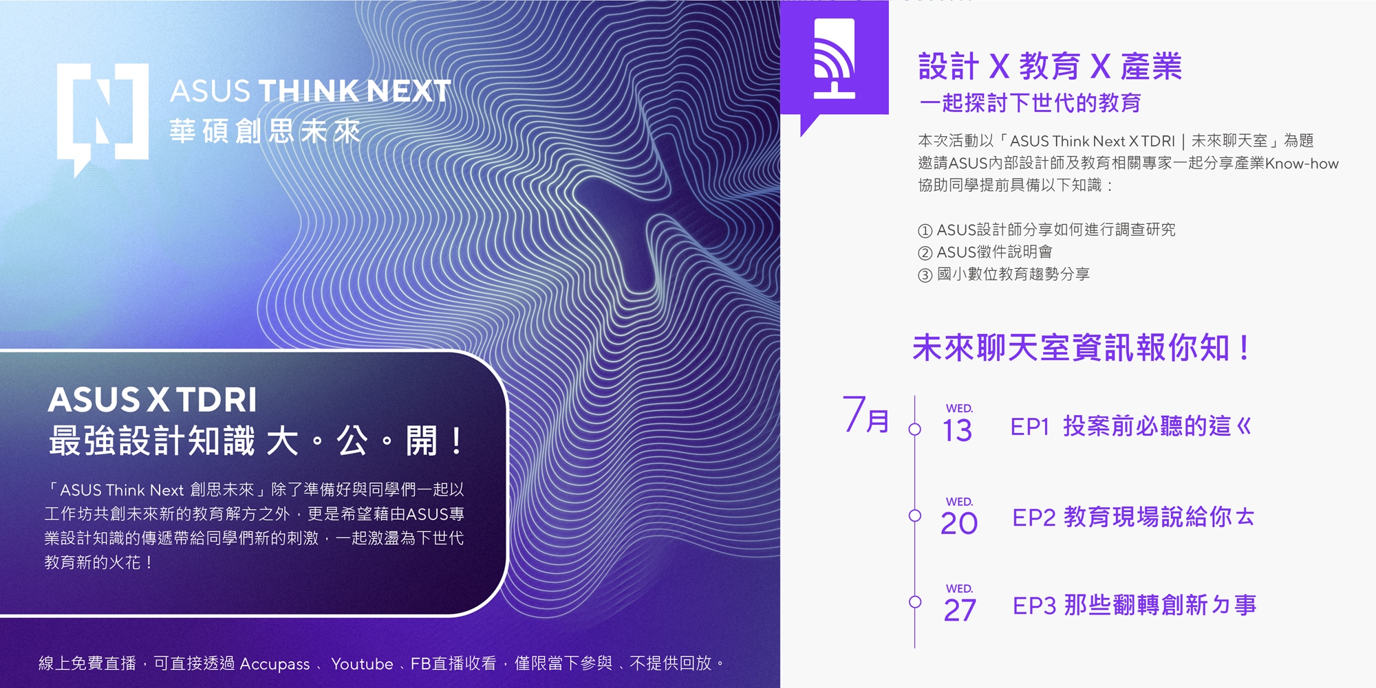 華碩以 Start with People 為信念,於2022發起「Asus Think Next|華碩創思未來」計畫,期望提供一個新世代共創共學的平台,為下一代打造更美好的未來。今年由TDRI與ASUS攜手合作,舉辦「𝗔𝗦𝗨𝗦 𝗧𝗵𝗶𝗻𝗸 𝗡𝗲𝘅𝘁 創思未來|徵件.工作坊」,即日起至8/5止,邀請全國大專院校在學學生,以「Alpha世代數位共學新方案」為題,一起探索疫情後的數位科技對於教育的下個創新機會點。本次徵件總獎金高達80萬元,通過初選的團隊還能參與三日產學共創Workshop!想了解更詳細資訊?一起打開 #未來聊天室,收聽最完整資訊!
