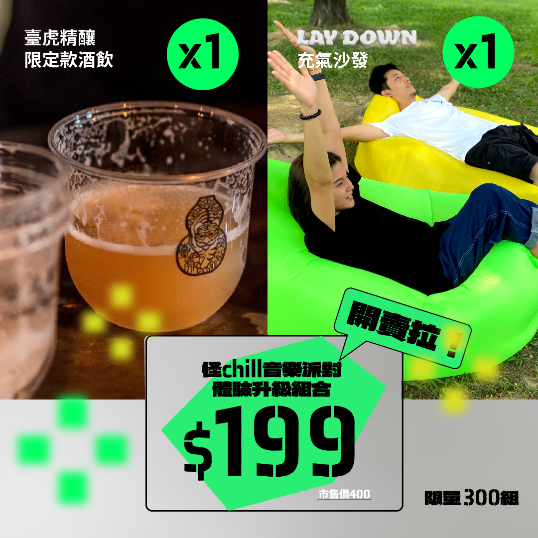 針對音樂活動有更好的體驗,我們推出了「 LAY DOWN體驗升級組合 」讓你在欣賞主題音樂表演時可以使用充氣沙發席地而坐,整體體驗更加升級舒適!