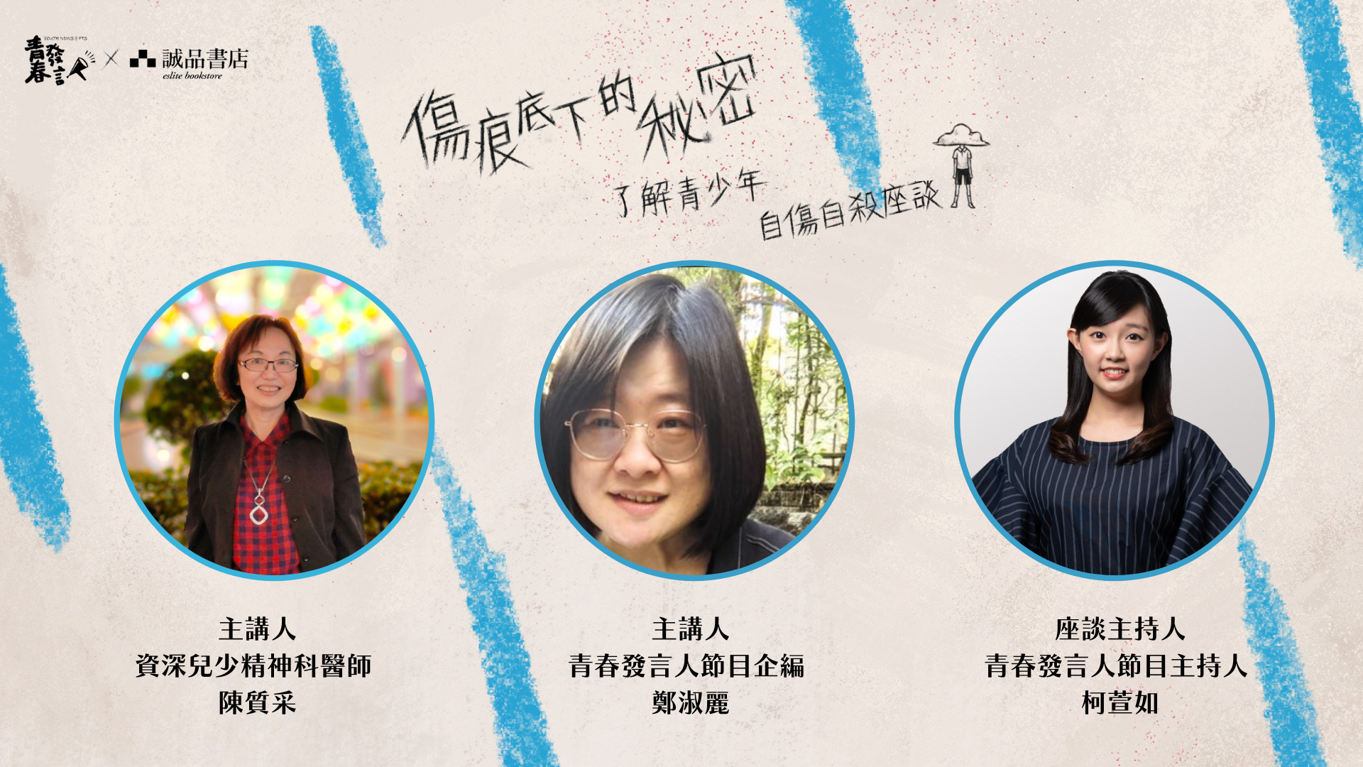 我活得好累,為什麼爸媽感覺不到?一向樂觀開朗的孩子,為什麼會自殺?公視節目《青春發言人》於6月底製作「青少年自傷自殺」專題,特別舉辦座談,邀請兒少精神科:陳質采醫師、製作專題的節目企編:鄭淑麗對談,提供多元視角,深入青少年絕望風暴的核心。