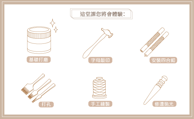 學習皮革基礎技法,縫製出優雅精緻的法式縫線,敲下屬於自己的紀念文字,適合初學或手作工藝的愛好者,也適合想要親手製物送禮的你,製作出屬於自己獨一無二的質感小物。