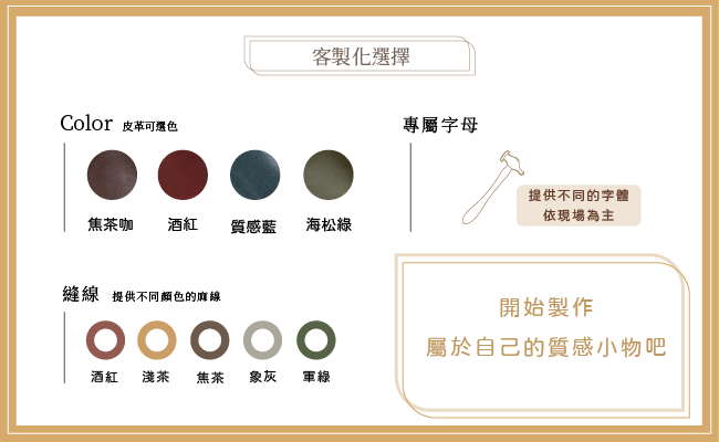 我們提供多樣化的選擇,皮料選色、縫線選色、字體選擇都由您決定,讓您拼湊出屬於自己美感的名片夾。