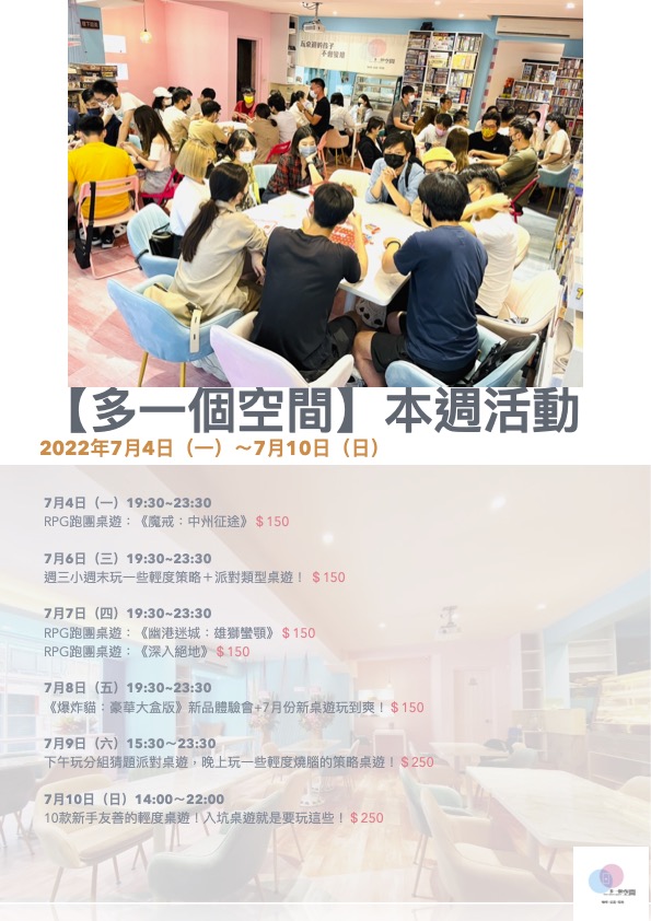 「多一個空間」由【多多看電影】的部落客-多多 所創立,一個致力於舉辦各種娛樂活動的場地,是一家複合式桌遊咖啡店,座落於龍山寺捷運站3號出口,視覺裝潢以馬卡龍粉與湖水藍為主要色調,與附近巷弄的古宅呈現極大的跳躍反差。