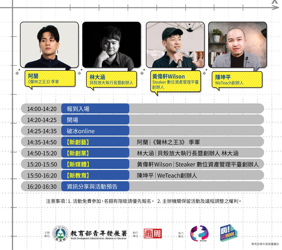 1. 本次活動全程免費。報名人數以300名為上限,優先開放 高中職、大學 在學生 參與。主辦單位保留審核報名學員參與資格之權利,完成報名後以執行單位通知為準。