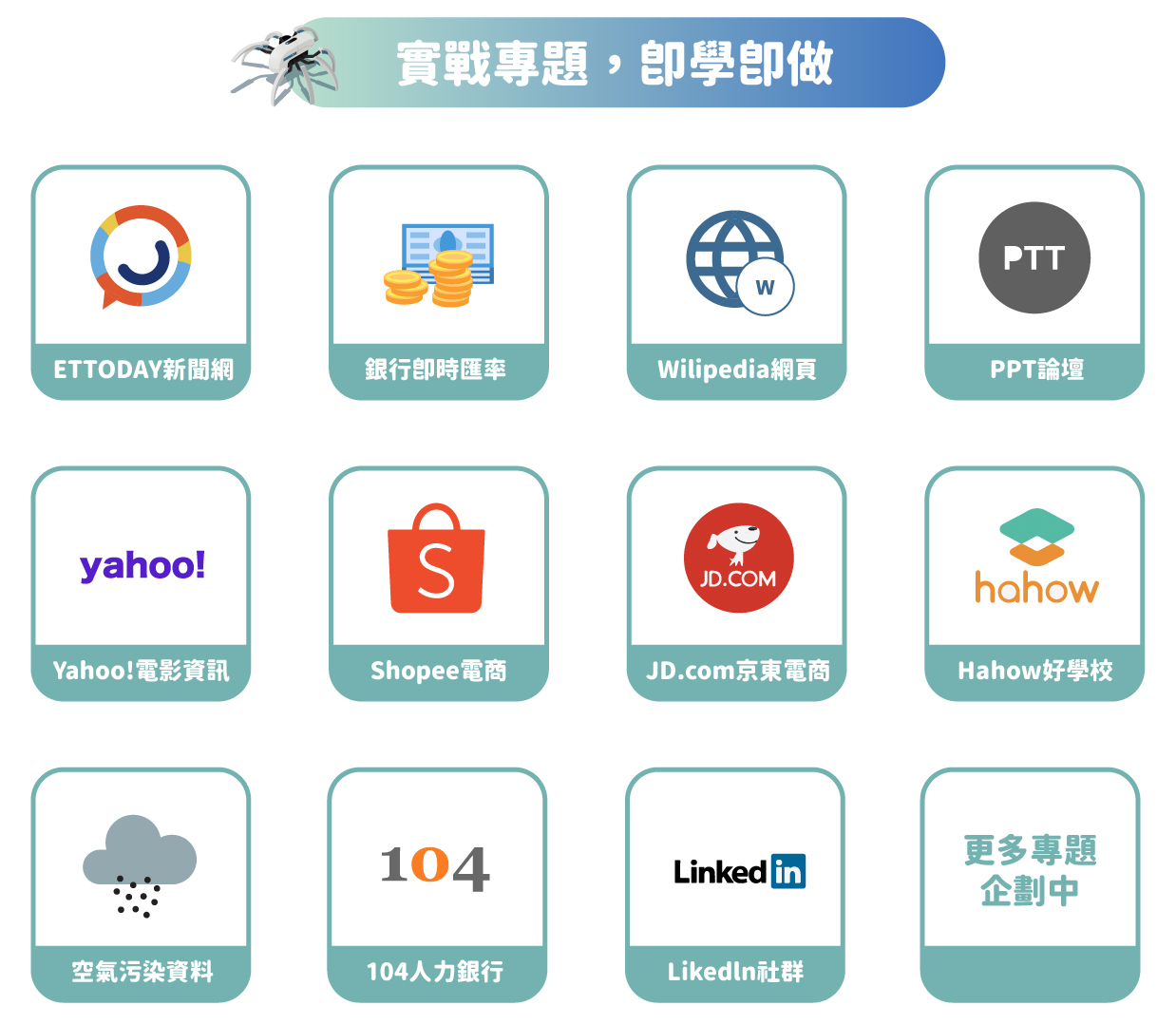 本課程不僅教你網路爬蟲的各個重要知識點,更以實務專題帶學員操作各種類型專題,每個專題都有相當高的實務應用性,此外,每個專題都有提供解答寫法與註解予學員參考。讓你最短時間獲得網路爬蟲完整即戰力。