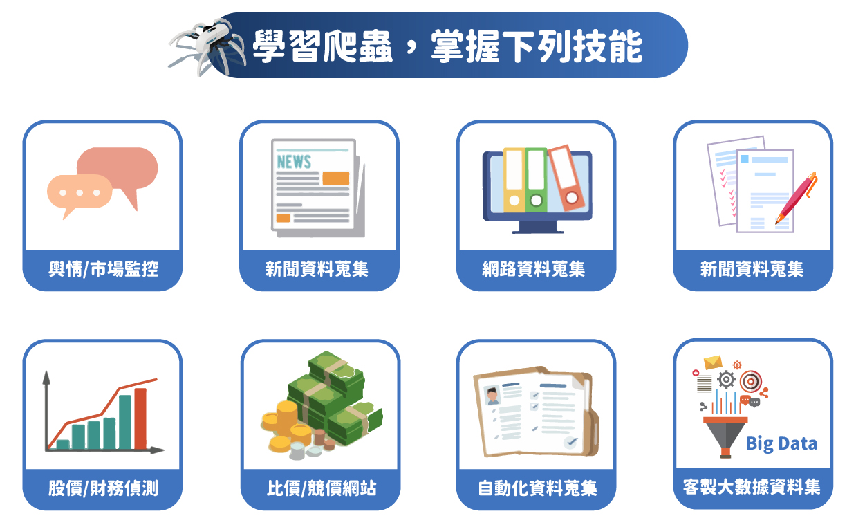 能善用「網路爬蟲」技術的人,可以更有效、精確地獲取目標資訊,從網路自動化地收集海量資訊,為後續機器學習的資料集舖路。本課程將讓你學習如何打造自動高效的爬蟲程式,幫你邁出資料科學成功的第一步。