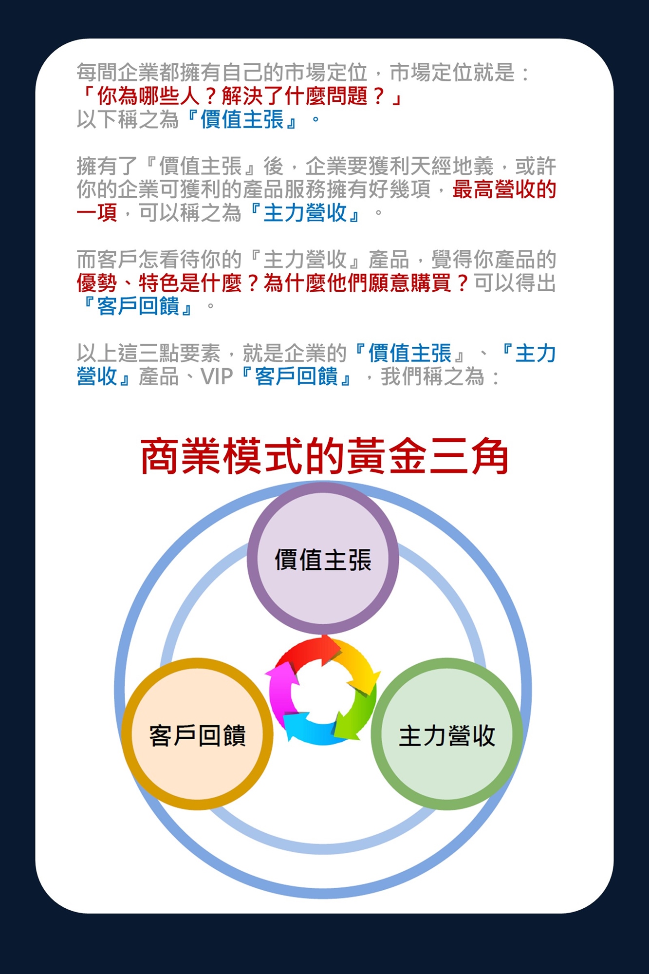事實上在台灣….有95%以上的微型企業(10人以下企業)都沒有達成黃金三角的『一致性』。