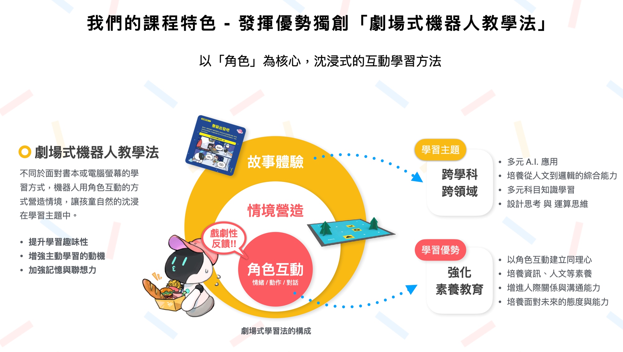 透過和機器人一起去考古探險,讓孩子在冒險故事中培養解決問題的能力。課程內容包含了解機器人的基礎構造、圖卡式程式編輯的邏輯,以及增進運算思維的練習。透過遊戲情境、步驟引導,帶領孩子逐步完成簡易的程式編輯,並實際操作機器人展現其編輯成果。劇場式的教學情境,讓孩子在學習過程中能即時得到反饋,增加學習樂趣,啟蒙孩子對科技領域的興趣!