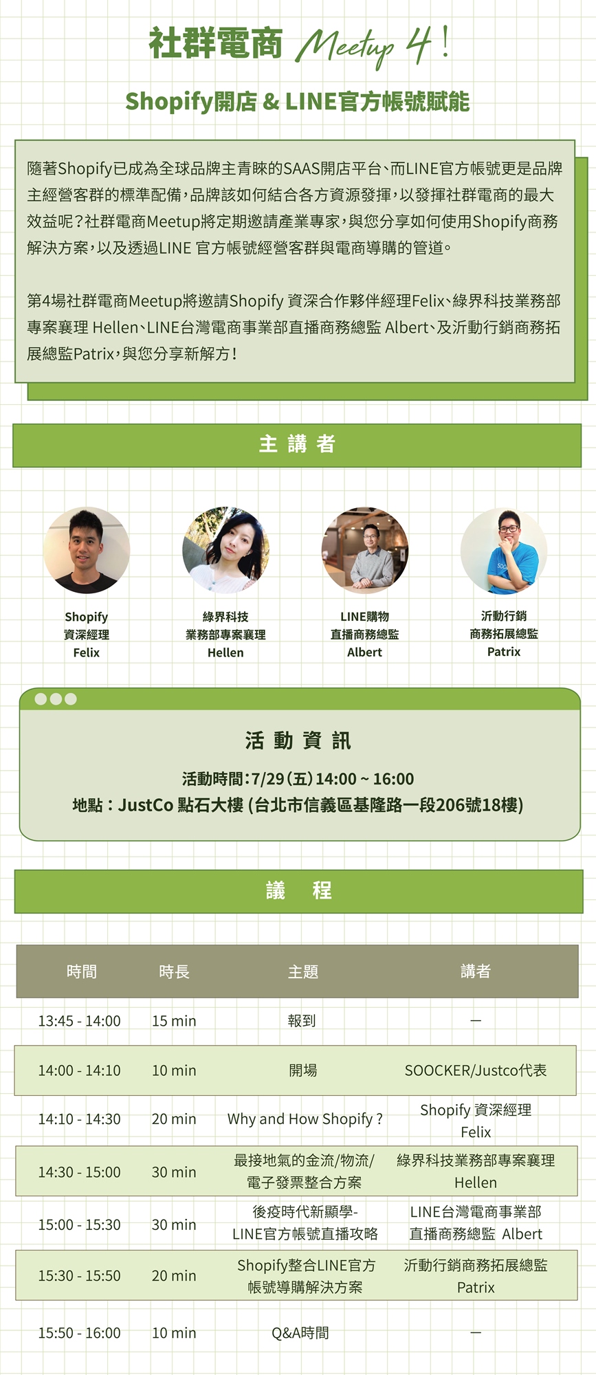 JustCo是總部位於新加坡、亞太地區最大的共享辦公空間品牌。JustCo台灣目前在台北共有信義區、中山區、松山區三處據點,2022年進軍竹北高鐵特區,開設第四處據點。JustCo提供彈性的會員方案,小至工商登記服務、共用辦公桌,大至客製化企業辦公室,能滿足個人工作者、新創團隊、中小企業和跨國企業對辦公空間的各種需求。JustCo舒適、寬敞的空間內同時提供各種大小的會議室和活動場地,適合公司行號舉辦各式會議、研討會、產品發佈會和社群活動。歡迎領取一日免費體驗通行證、加入亞太地區最大的共享辦公社群!