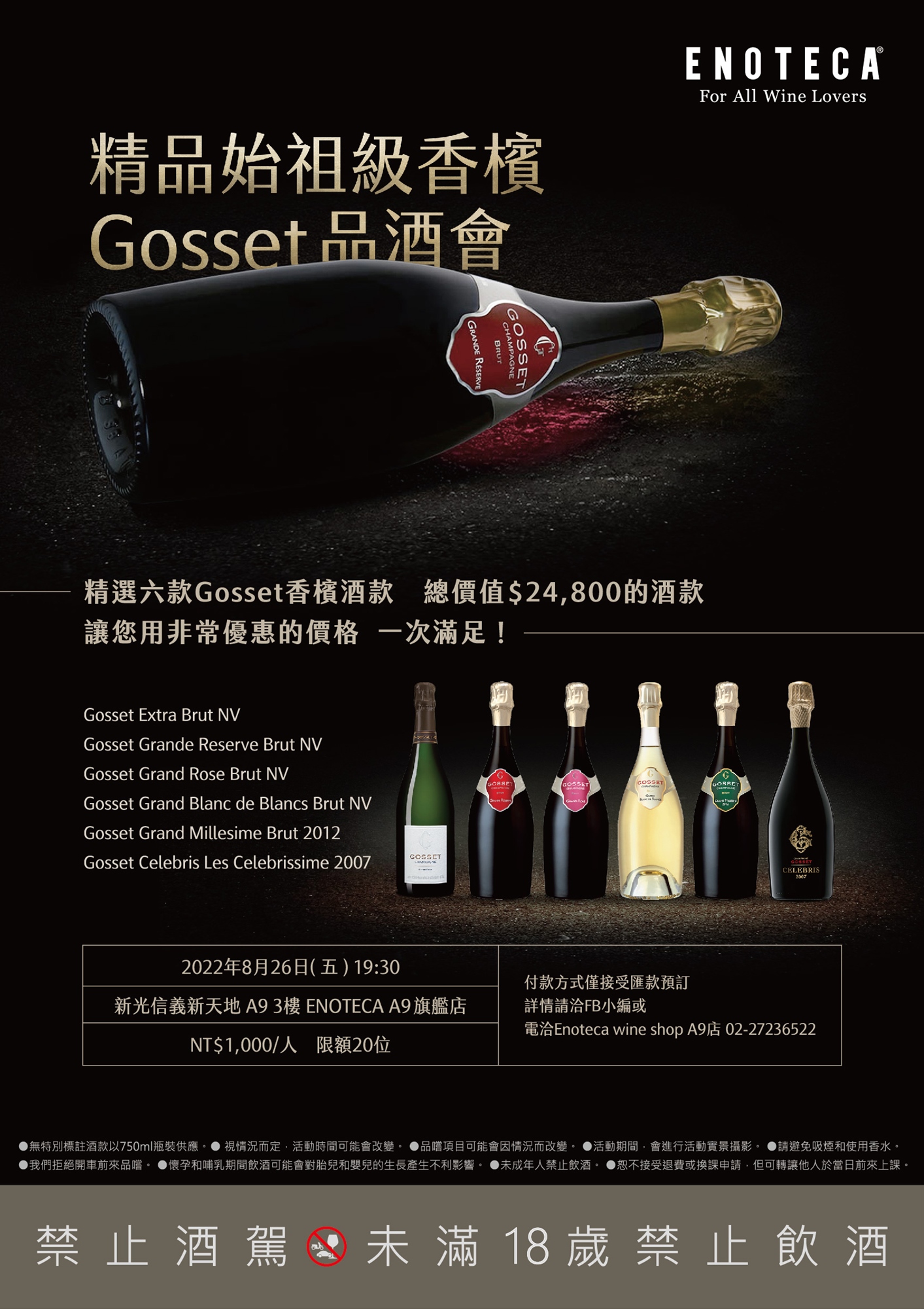 法國香檳始祖酒莊GOSSET酒莊代表詳細解說,引導各位貴賓共同品飲並暢談酒莊的迷人故事!精選六款Gosset香檳酒款,總價值$24,800的酒款,讓您用超值優惠價格,味蕾享受一次滿足😋!