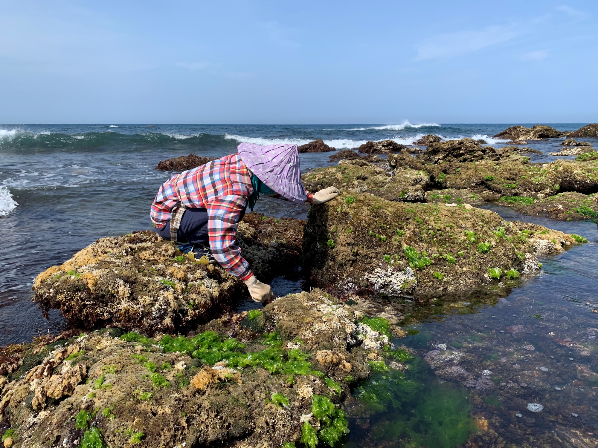 阿嬤帶著孫女在海岸上撿拾寶螺,從浪花中、礁石縫,從極東潮濕的海坪上,拾起古老傳說,傳遞著生存的智慧,這是屬於馬崗人特有的記憶。