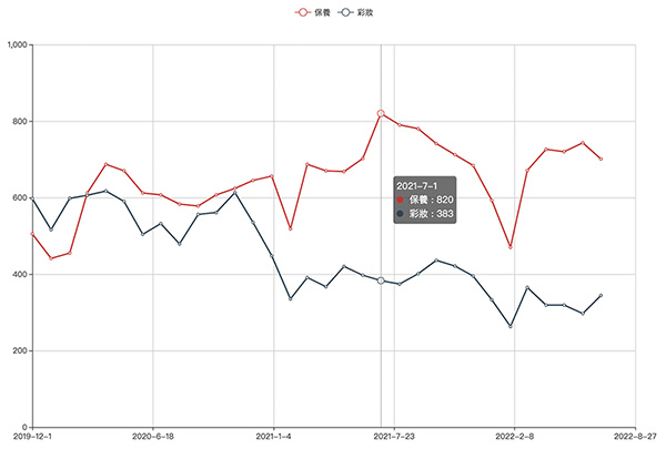 疫情改變消費習慣,日常需配戴口罩的時間變長了,人們對於肌膚保養貼文的關注也日漸大於關注彩妝貼文,根據達摩媒體社群關鍵字分析系統顯示,自 2020.3.1 之後#保養 的相關 IG 貼文數超越 #彩妝,而在 2021.7.1 來到 2 倍以上的差距。