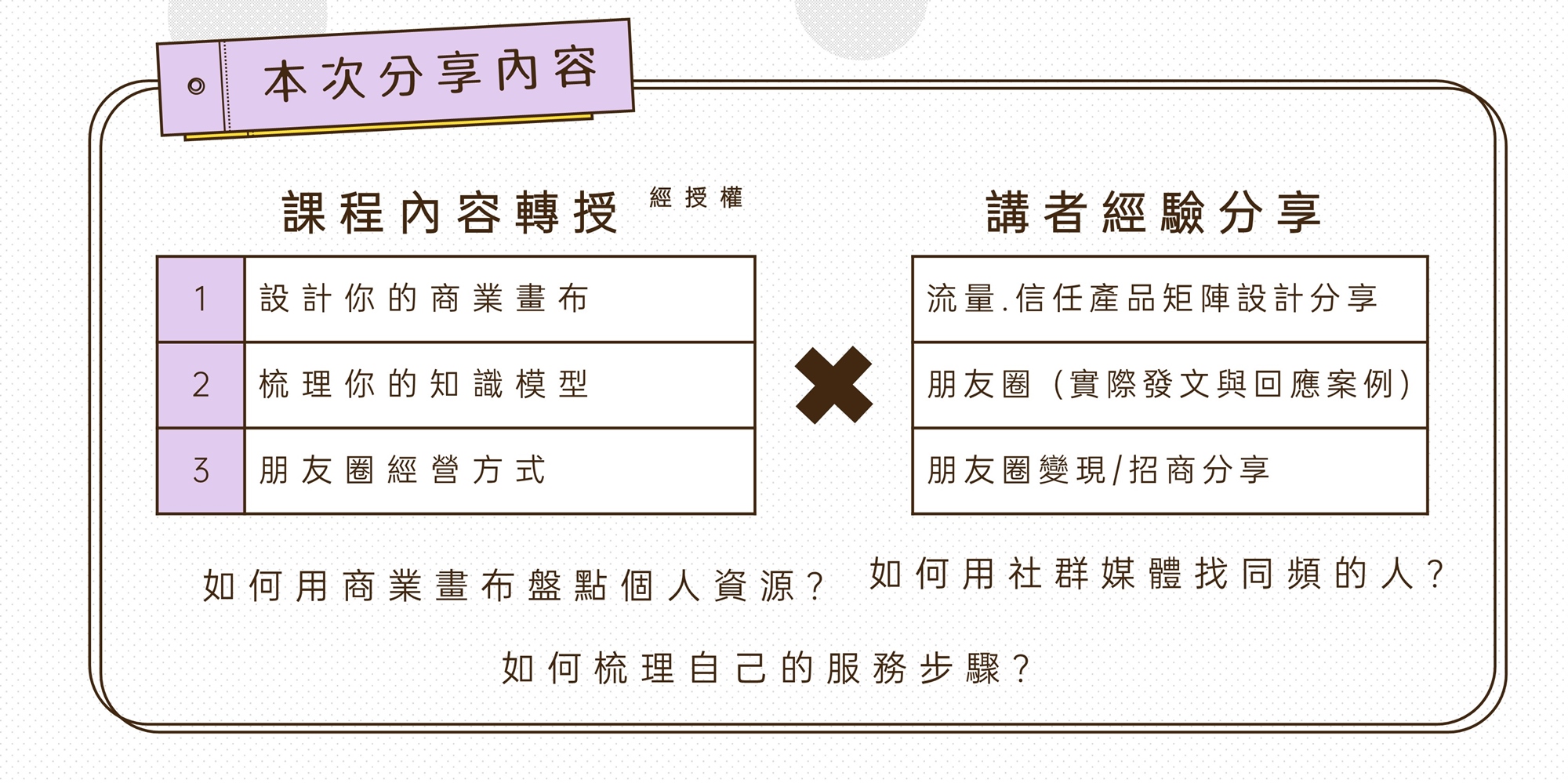 本次主題圍繞在商業畫布、產品矩陣與朋友圈經營上,會與你分實例,歡迎提出問題討論喔,即使不在讀書會當場回覆,會於讀書會私人群或文章回覆喔。