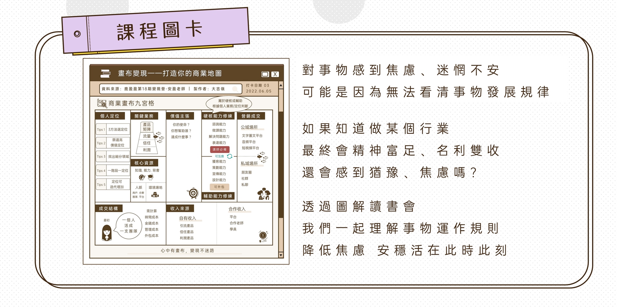 在進入學院學習過程中,我才真正的去畫商業畫布,以及開始思考,要怎麼去打造自己的知識體系、產品體系,後來又因為發布課程圖卡,被學院創辦人看到,被邀請協作圖卡,未來又有機會參與一些營運,讓我開始思考,是不是將這個課程分享給跟我一樣在知識IP賽道上的人。
