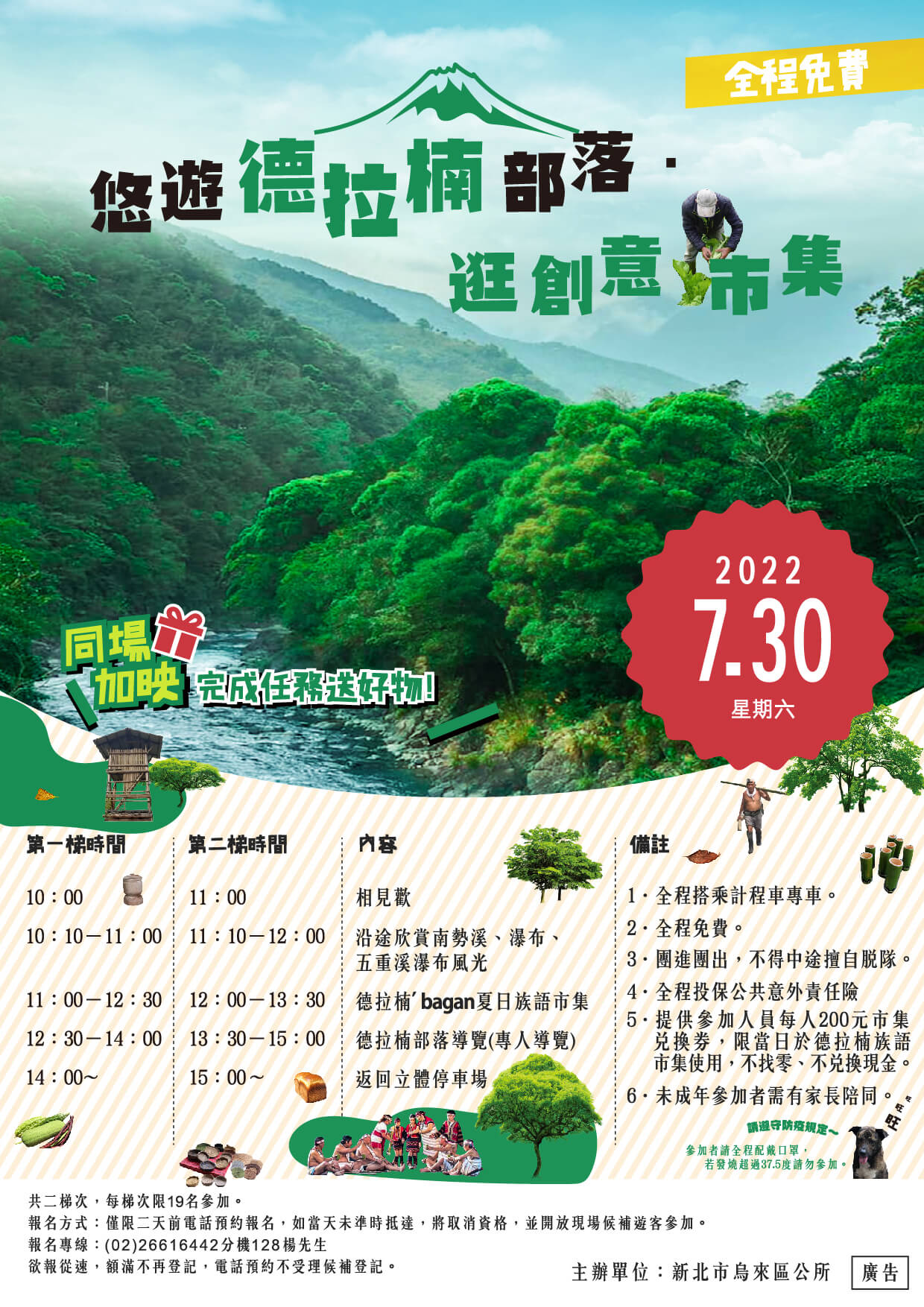 4.全程投保公共意外責任險 5.提供參加人員每人200元市集兌換卷,限當日於德拉楠族語市集使用,不找零,不兌換現金。 |