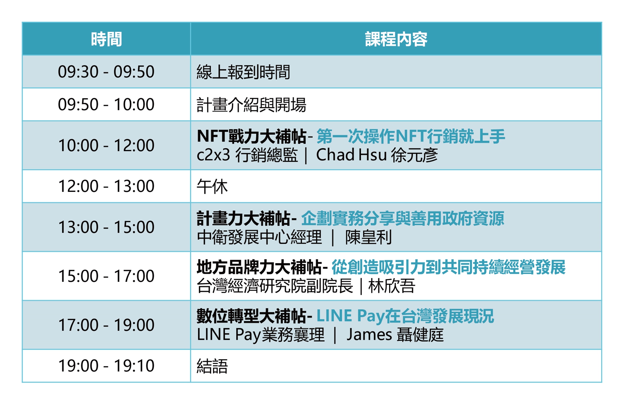 挖掘文化商機、集結地方品牌力、提升撰寫計畫的書寫技巧,更帶來數位轉型及NFT世界的社群行銷,帶領業者迎擊市場硬仗,提升自家品牌企業的曝光度,強化業者品牌及產品的數位連結,在網路行銷中找出成長突破口。